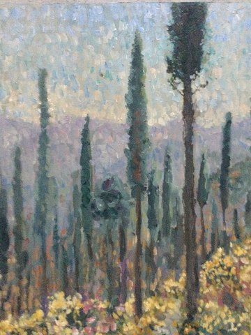 Ubekendt kunstner (20 årh): Cypresser i blomsterhave. Olie på plade. Antagelig Frankrig eller Italien. usigneret uden ramme 39x37 16310