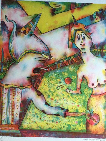 Anne- Marie Brauge (1942-2003): Surrealistisk komposition 1995. "Bastarden" Farvelitografi på papir. Sign.: Anne-Marie Brauge 95. Nr. 116/120 Uden ramme 46x38 3417