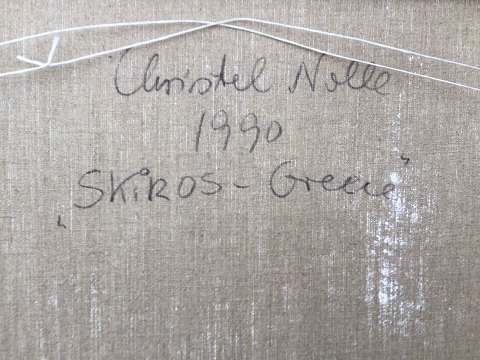 Christel Nolle (født 1951): Eksteriør ved hus på Skiros, Grækenland 1990. Olie på lærred. Sign.: CN Bagpå - Christel Nolle 1990 - Skiros Greece. 55x65 (61x71) 14025