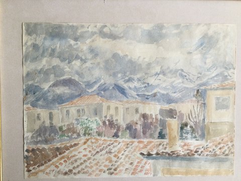 Ellen Krause Rørup (1905-90): Parti fra Sparta 1962. Akvarel på papir. Sign.: Ellen Krause Betegnet - Sparta 6-2-62. Smuk guldramme 28x39 (43x52)