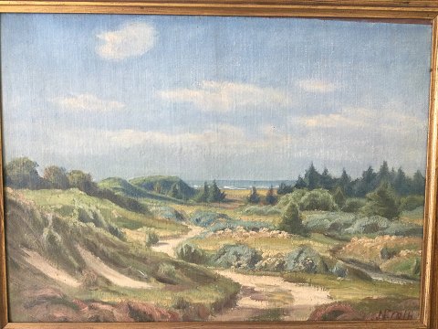 Ingvor Groth (1891-1967): Klitparti med graner. Olie på lærred. Sign.: I. Groth 35x48 (43x56)