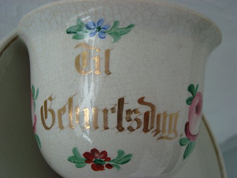 Dekoreret med blomster og teksten "Til Geburtsdag"