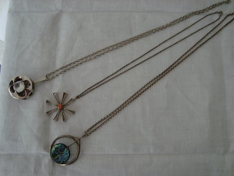 Spændende 60'er vedhæng med perlemor (diameter 4 cm) (kæden 60 cm) (Stemplet for Carl Ove Frydensberg, København, samt Sterling Denmark)(se foto) - kr. 850,00.