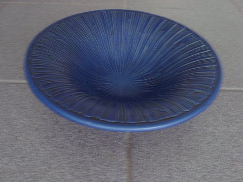 Axel Sørensen (1891-1967): Dyb blå bordskål med relief dekoration. Lavet for P. Ipsens Enke Bornholm. Stemplet: AS PIE Denmark 20 XI. Diamter -26½ cm. Højde - 7 cm.