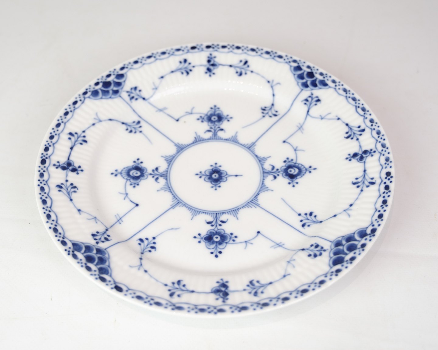 Dinner plate marked 1/577 from Royal Copenhagen. Made of porcelain with classic blue fluting half lace design. Hand painted in blue decoration.