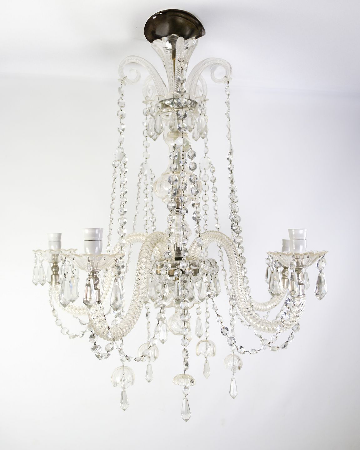 Large prism chandelier with five glass arms with electric light source from around the 1930s. Has many beautiful prisms and is in very nice antique condition.