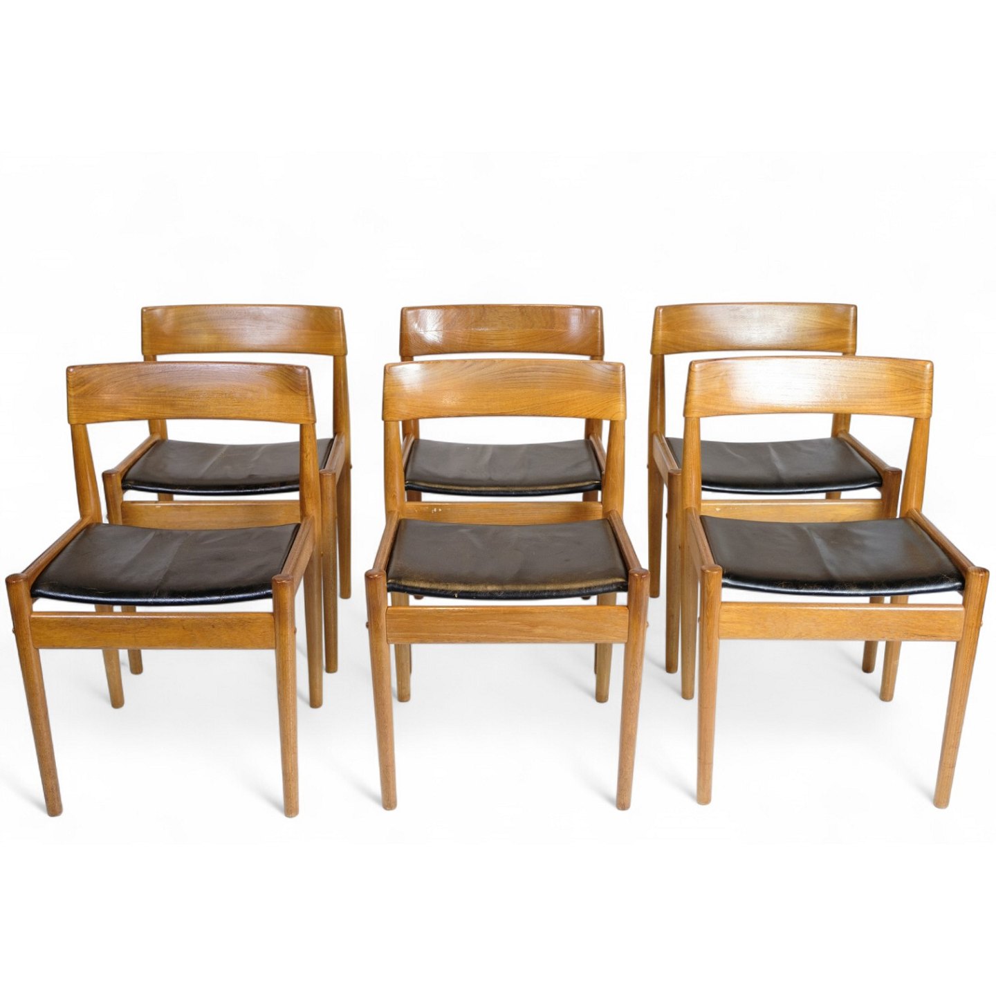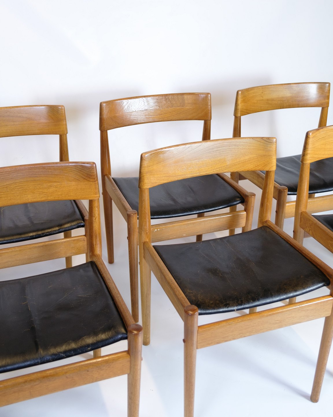 SoldSet of six dining chairs made of teak with seats in original upholstered black leather. The chair is designed by Grete Jalk and produced by Poul Jeppesen. The chair was given the model number P J 3-2. The chairs are from the 1960s and are in great condition with age-related patina on the seats.