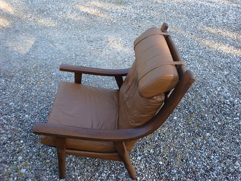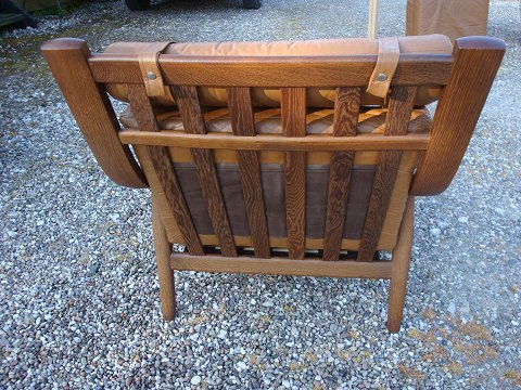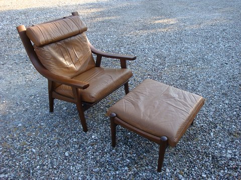 Stol med skammel i egetræ med brunt skind lavet på Getama Møbelfarik designet af Hans Wegner