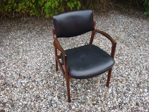 SolgtSkrivebordsstol i palisander og med sort læder på sæde og ryg.