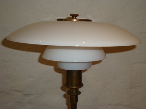 PH Bordlampe 3/2 med opalskærme, stander og fod i blankpoleret messing og med gennemgående afbryder. Lampen er fremstillet i 1930érne.