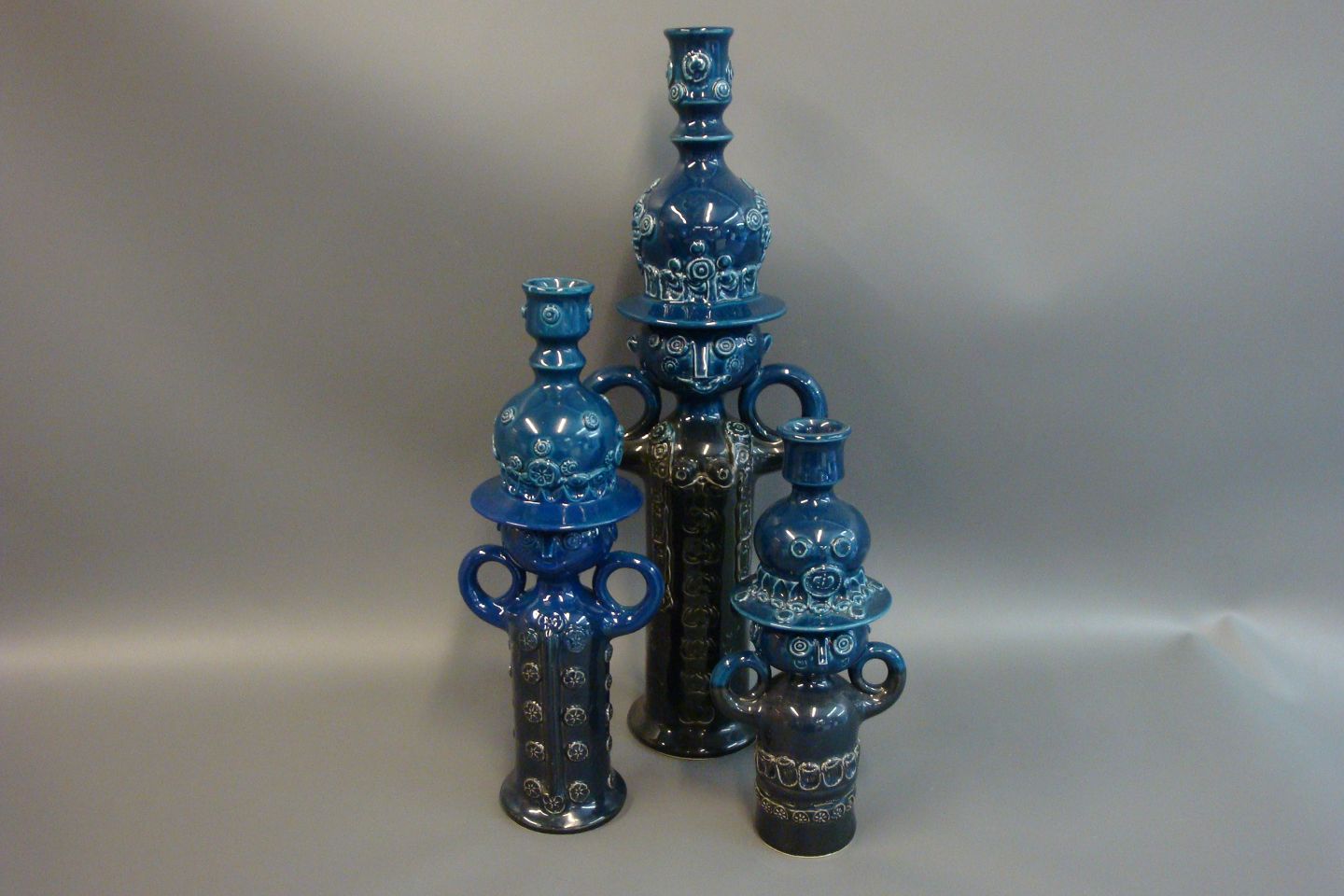 Sold3 pcs blue candlesticks shapes in different sizes of bjørn Wiinblad Rosenthal studio-line height: 26.5, 33.5, 47.5