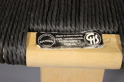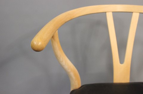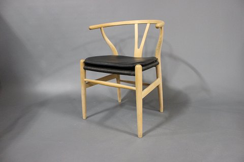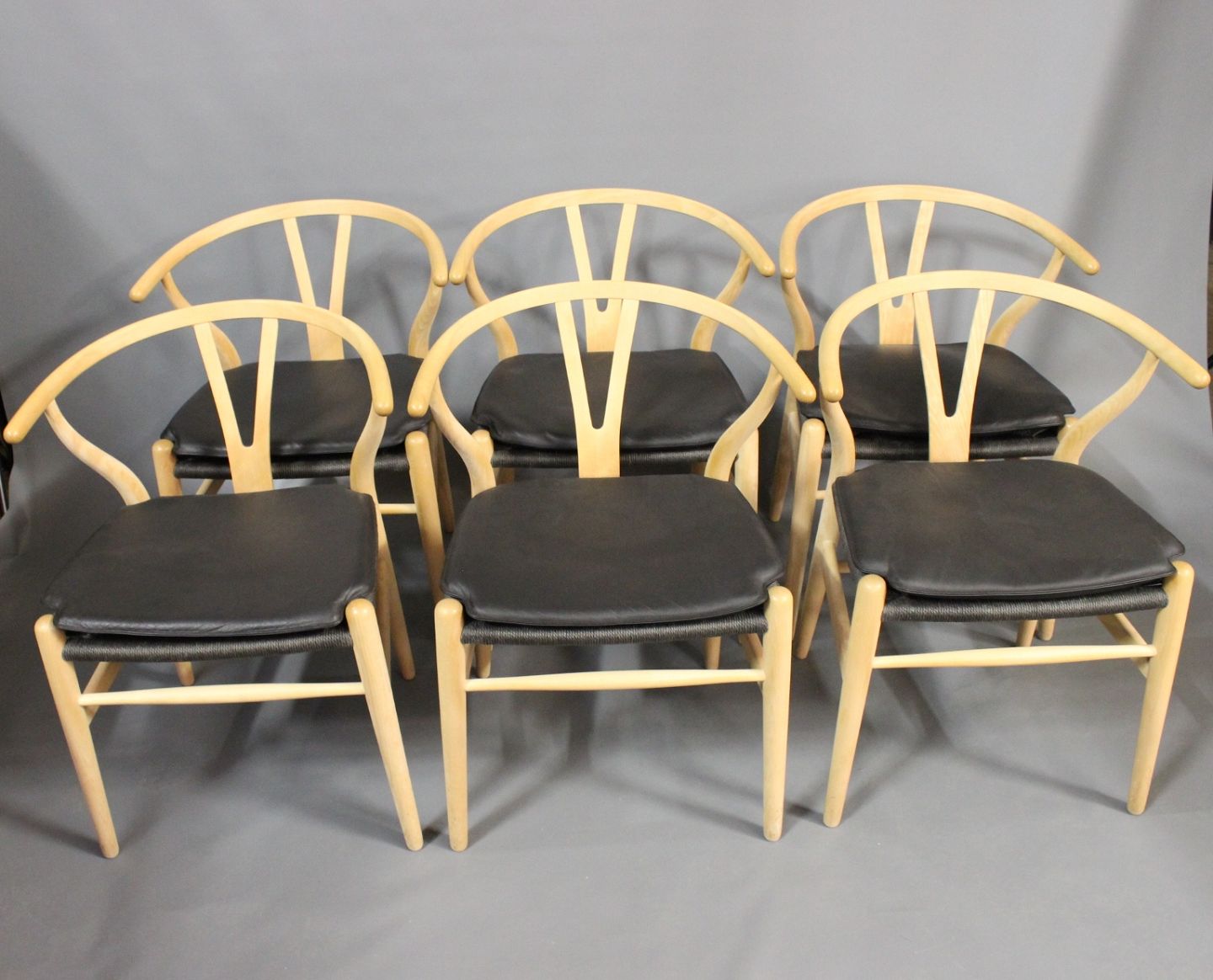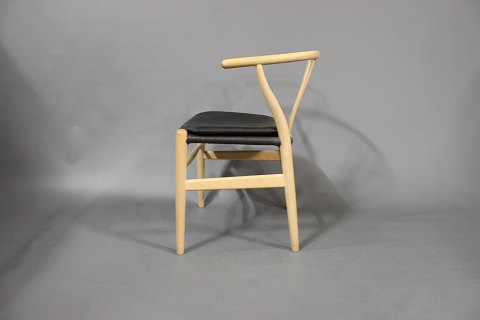 Seks Y stole, model CH24, designet af Hans J. Wegner i 1950 og produceret af Carl Hansen og søn møbelfabrik i 1980erne. Stolene er stemplet med mærket dansk møbelkontrol. Y stolene er lavet af bøg med sort papirgarn og sorte læder hynder.