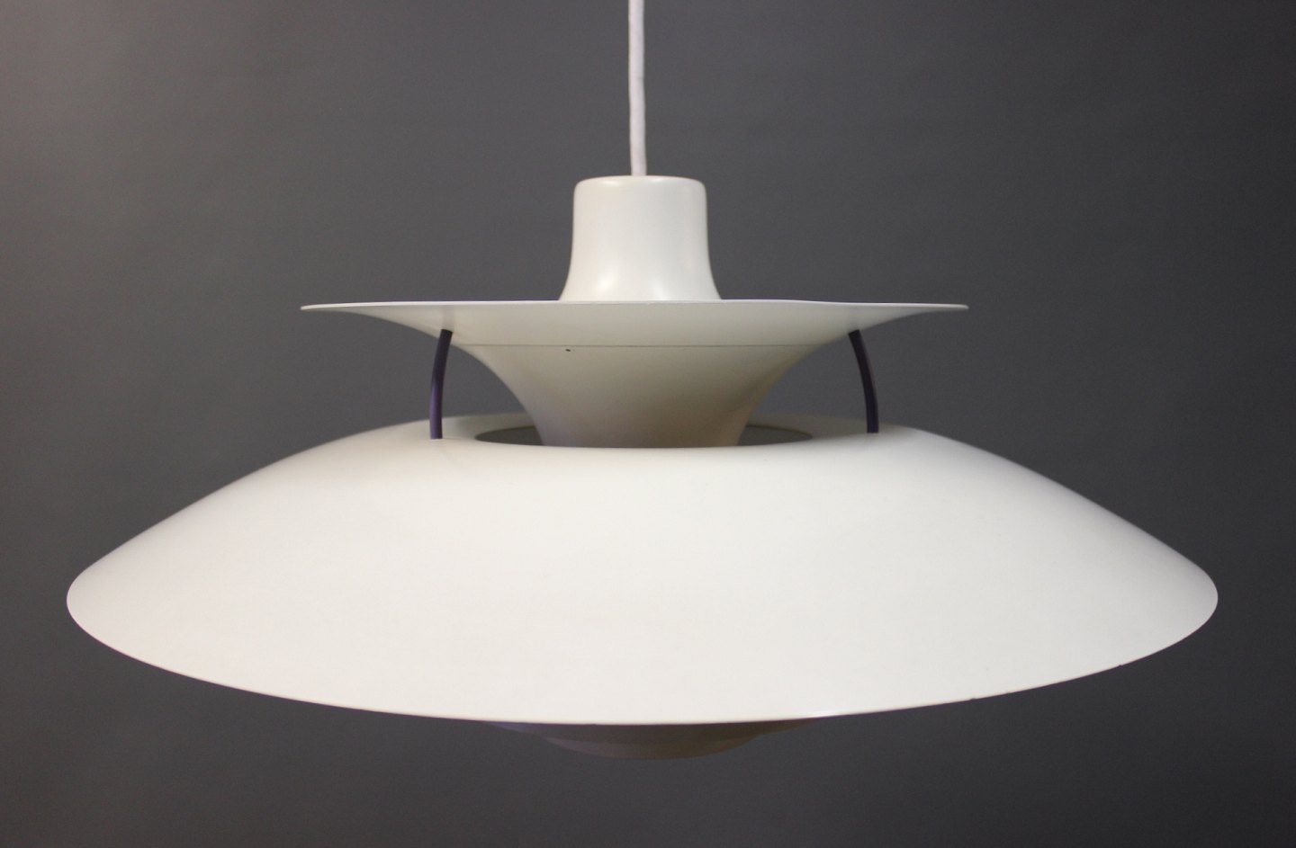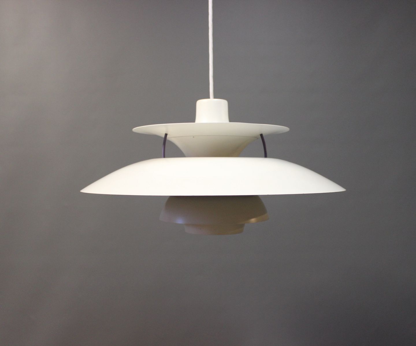PH5 lamp designed by Poul Henningsen in 1958 and produced by Louis Poulsen. The lamp has white lacquered metal shades.