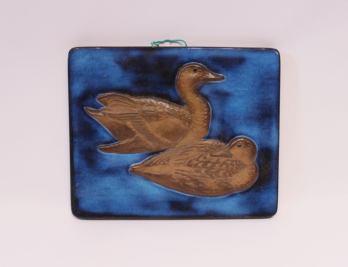 Flot keramik relief med to ænder på blå glaseret baggrund af Leif Rydeng for Alumina, nr.: 560/2903.