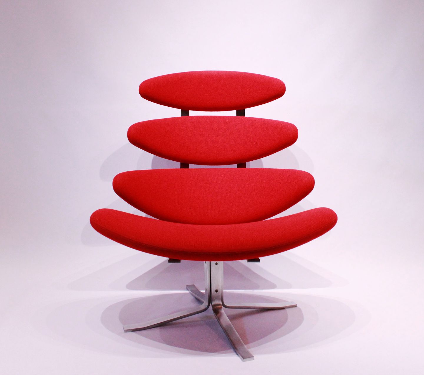 Corona, model EJ 5, i rødt stof, af Poul M. Volther og Erik Jørgensen.