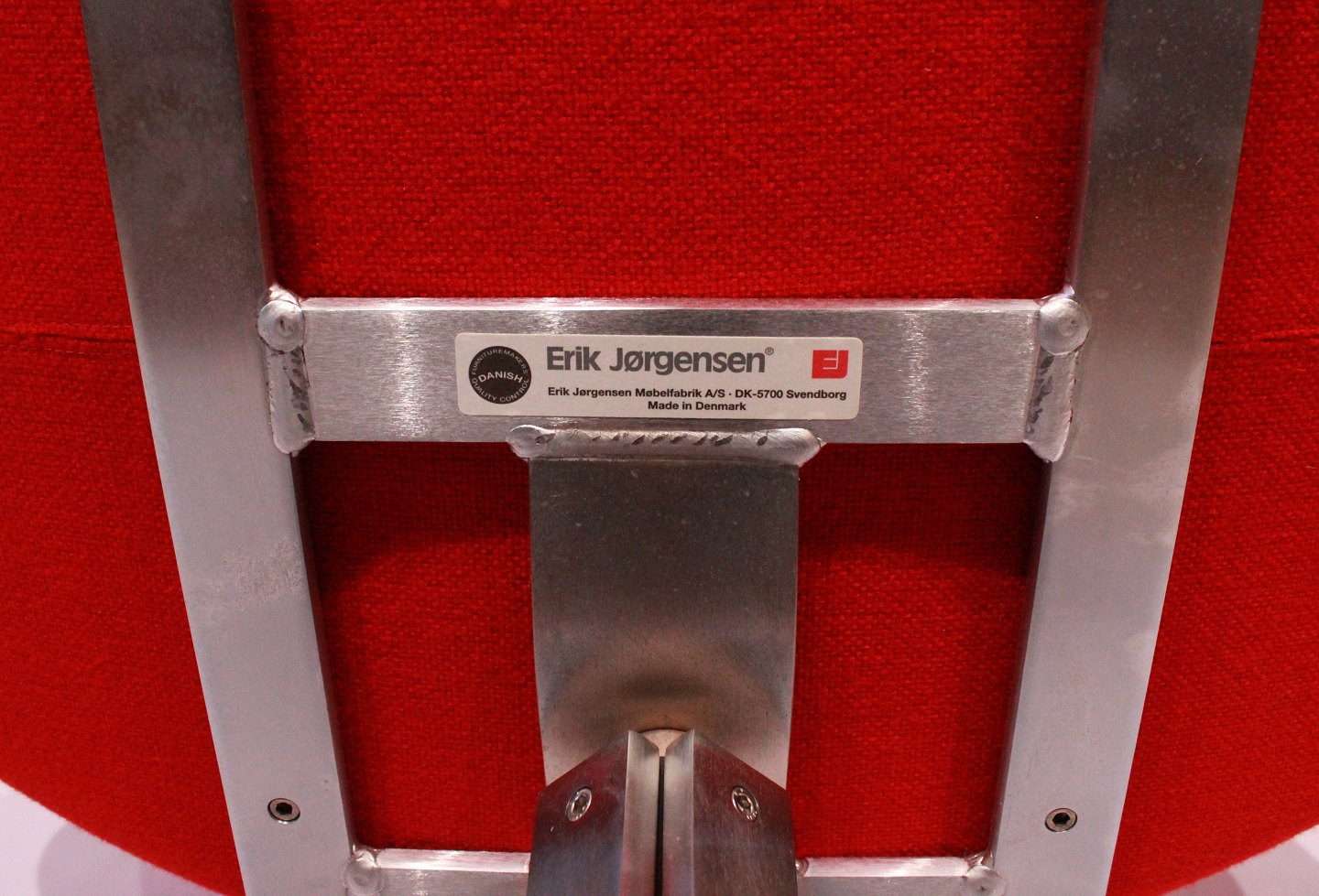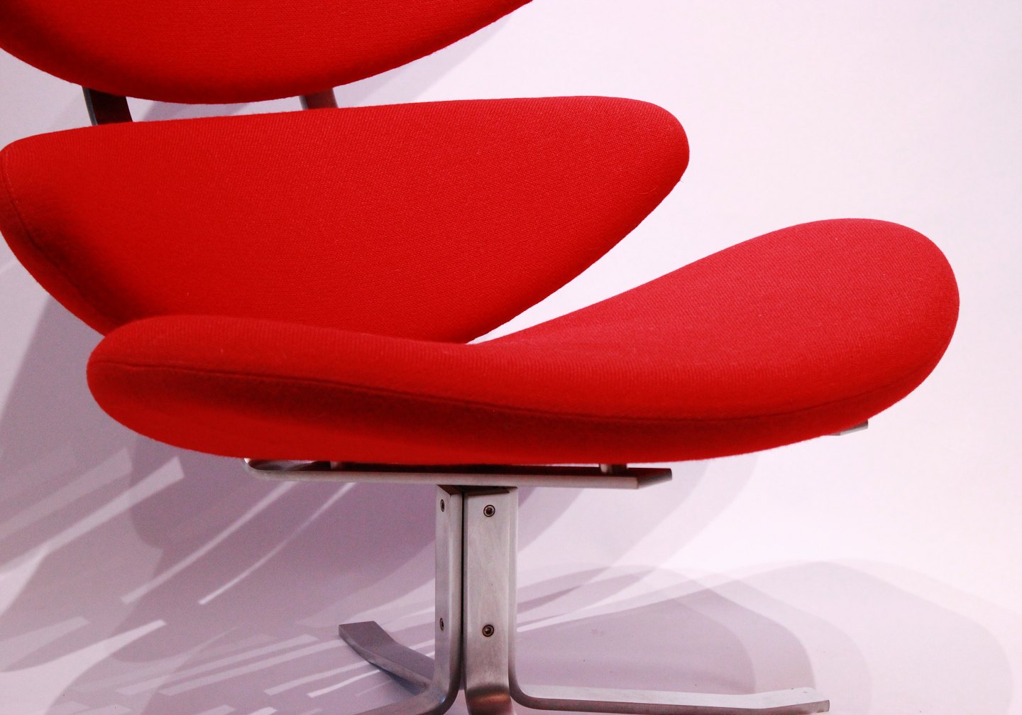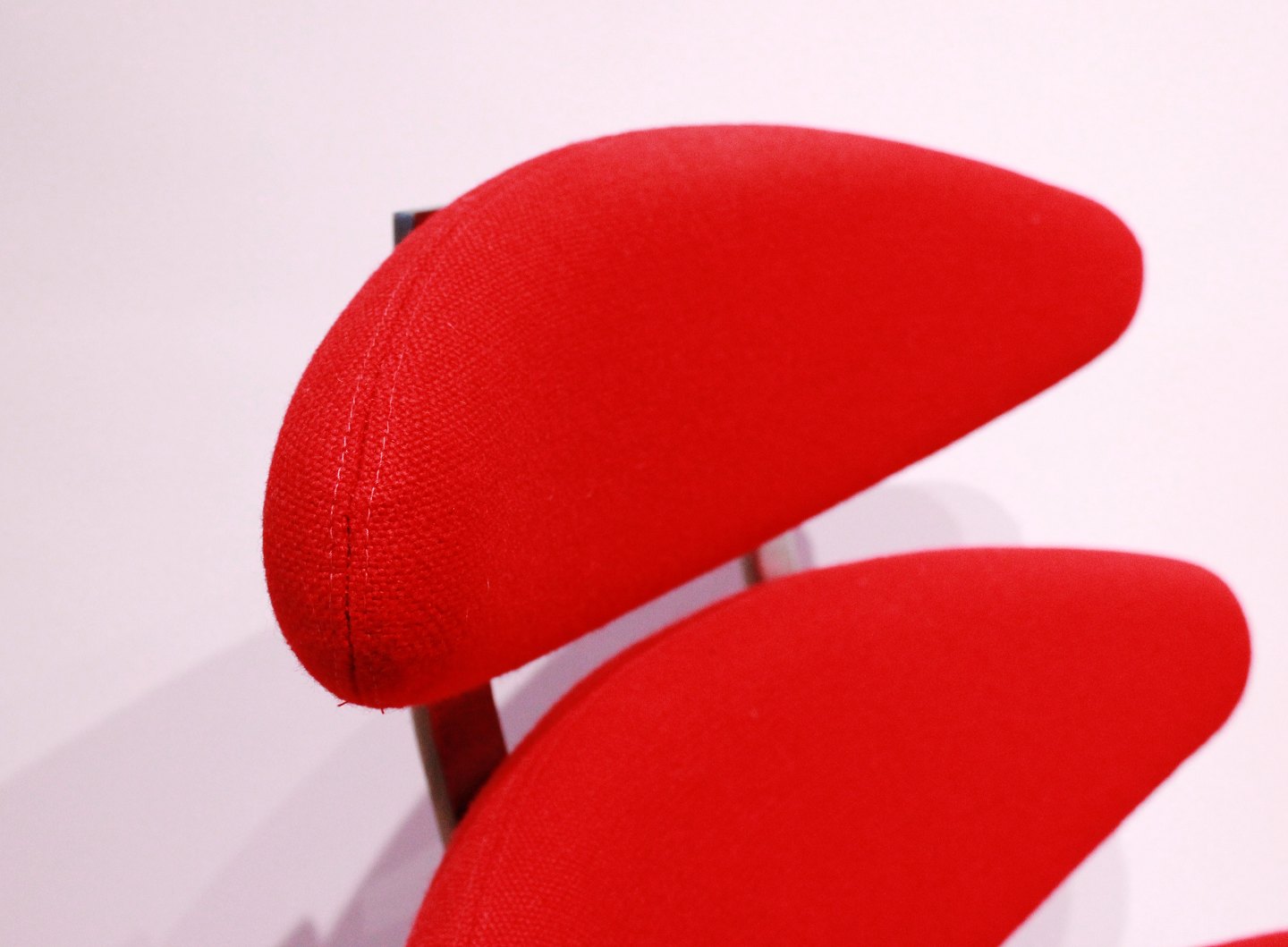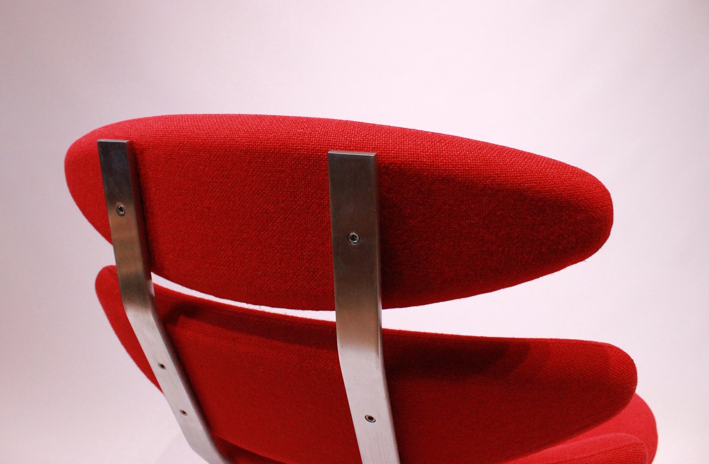 Corona, model EJ 5, designet af Poul M. Volther i 1964 og fremstillet hos Erik Jørgensen. Stolen er polstret med rødt uldstof.
