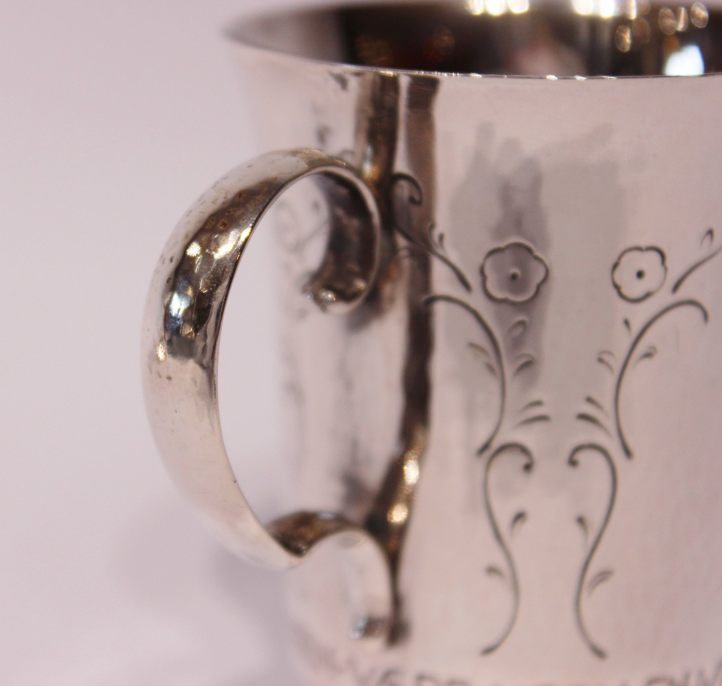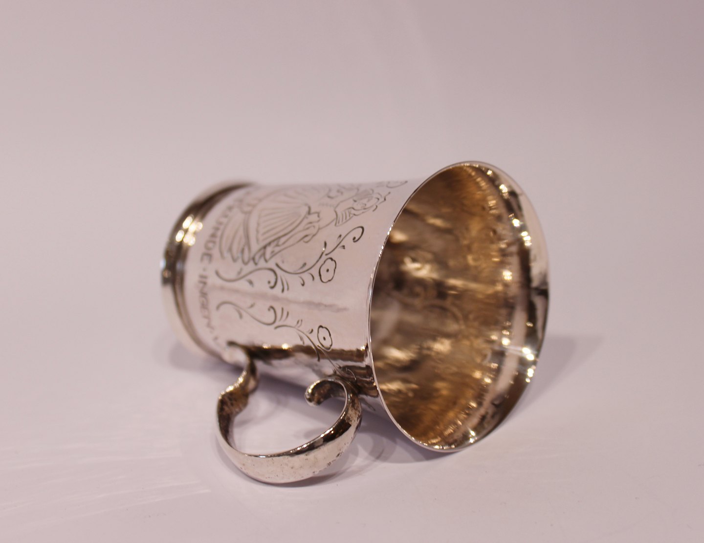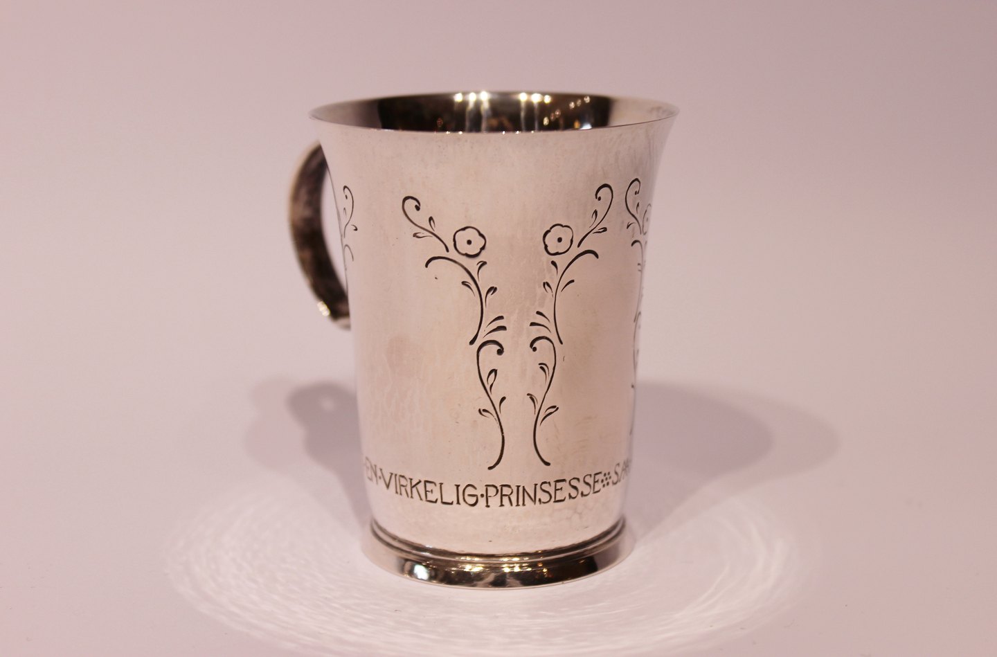 Child's cup with words from "The Princess on the pea" from 1929 and in hallmarked silver, stamped EN by Evald Nielsen.