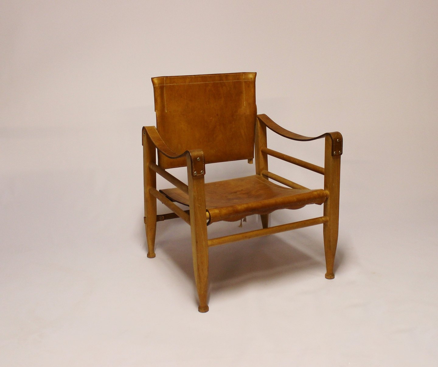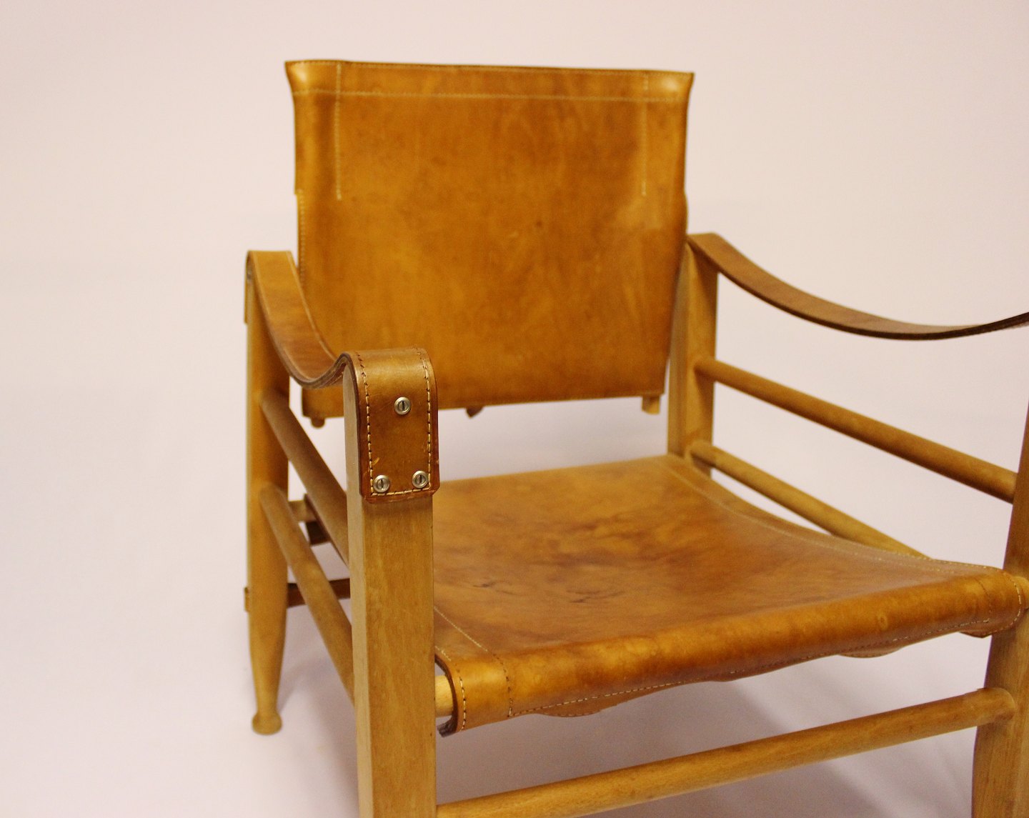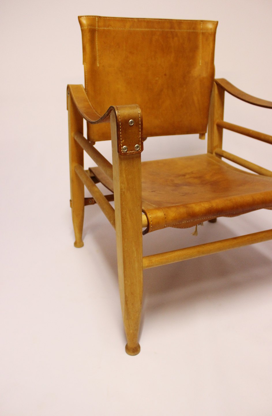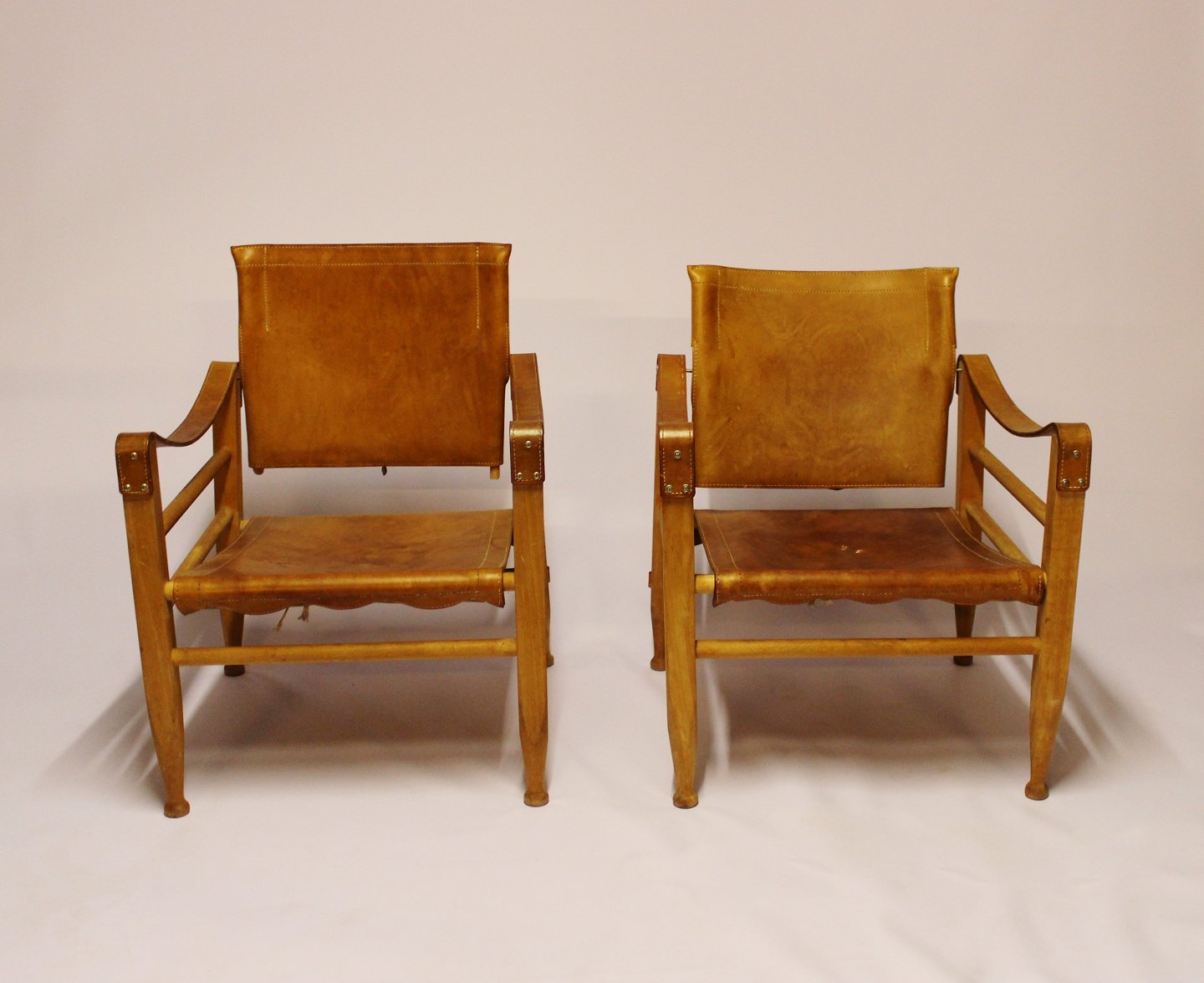 SoldA pair of Safari chairs designed by Aage Bruun and Son, of natural leather and solid wood, from the 1960s.