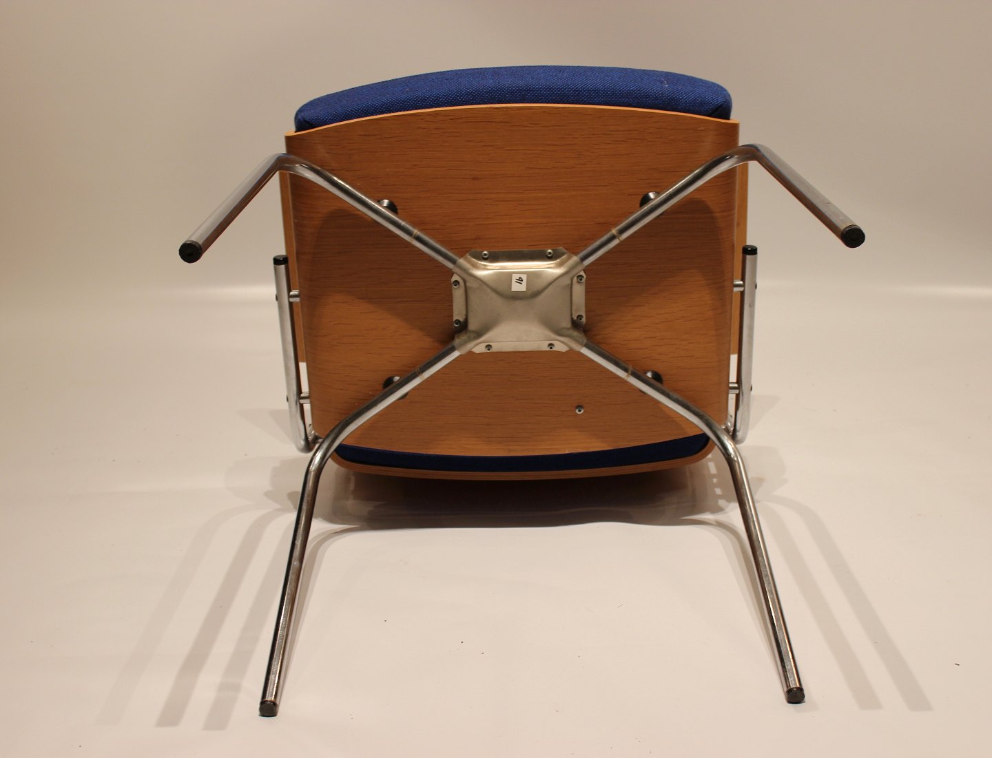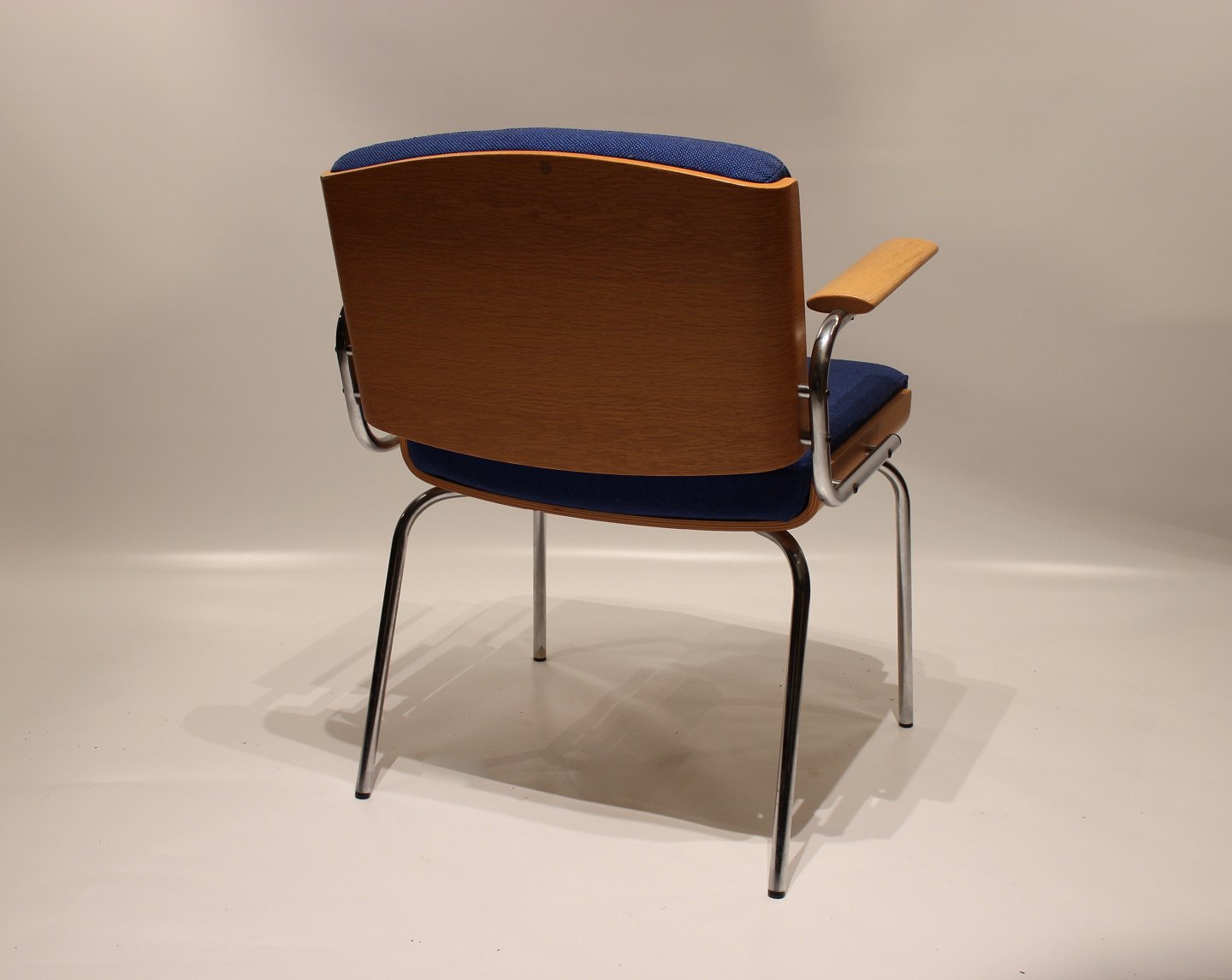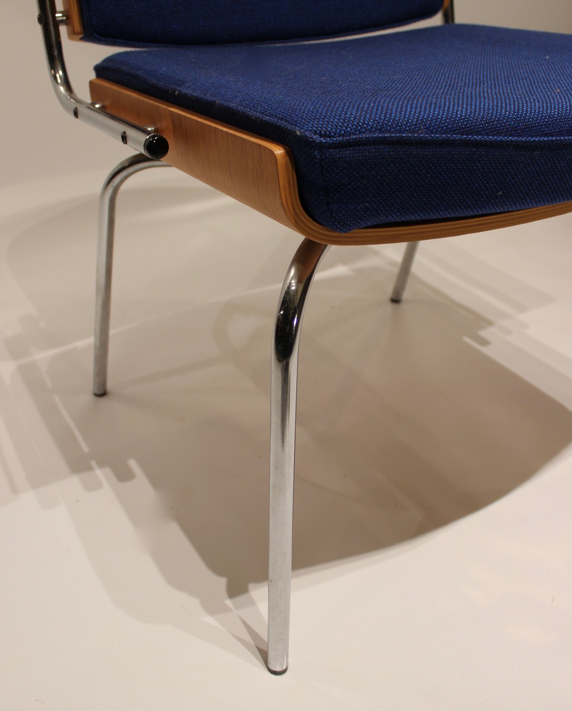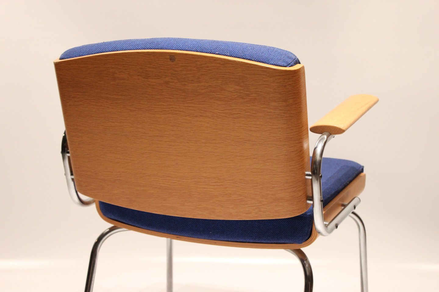 SoldConference chair with blue wool fabric and oak manufactured by DUBA. We have 6 chairs in stock and all are in great vintage condition.