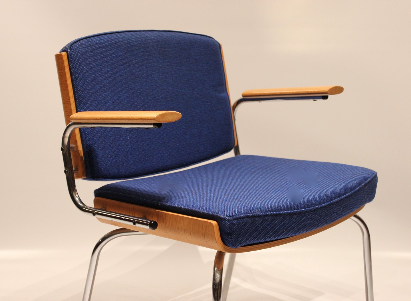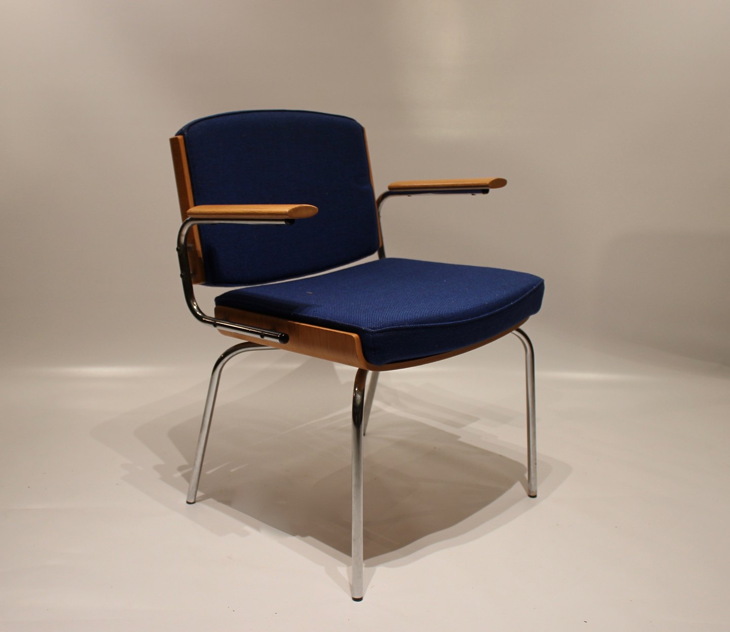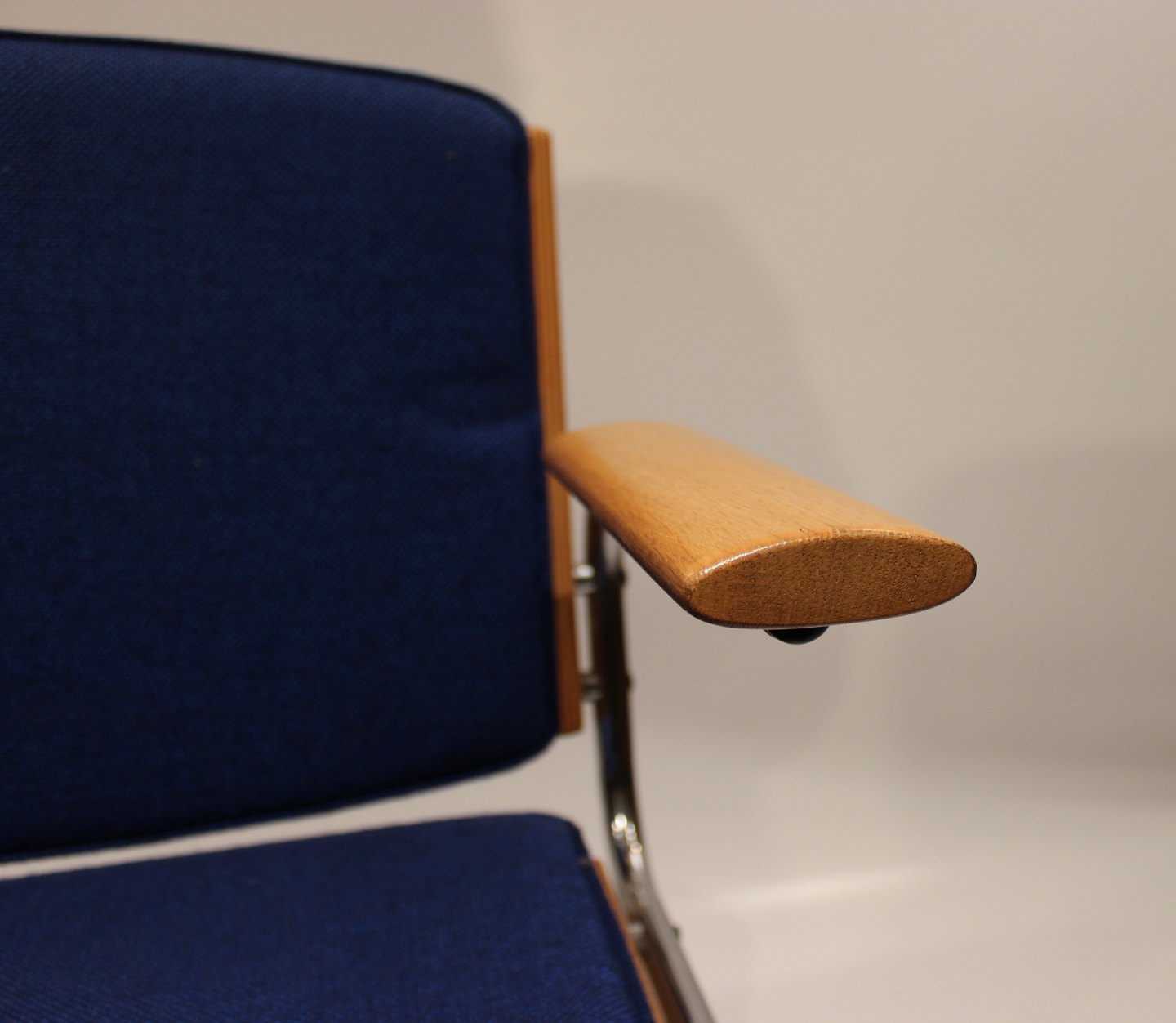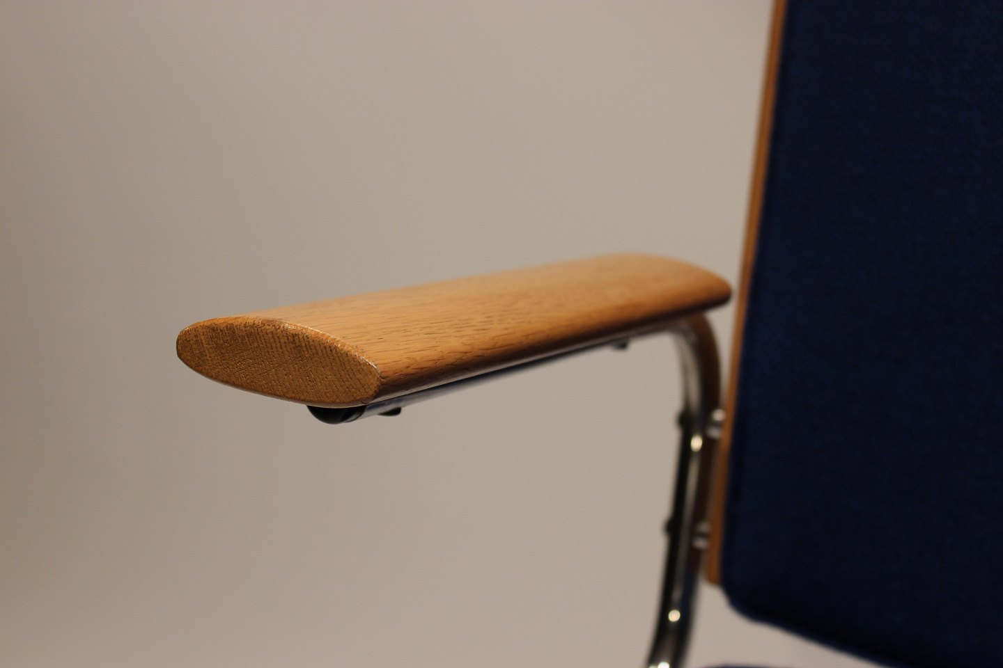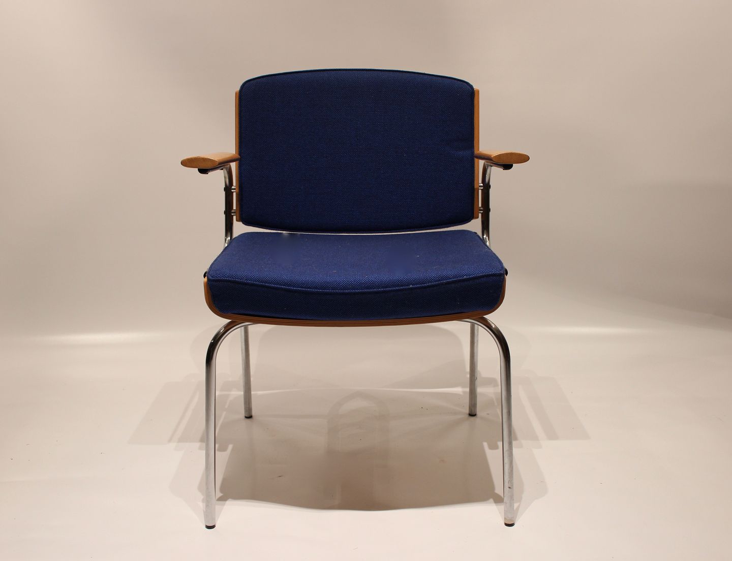 SoldConference chair with blue wool fabric and oak manufactured by DUBA. We have 6 chairs in stock and all are in great vintage condition.