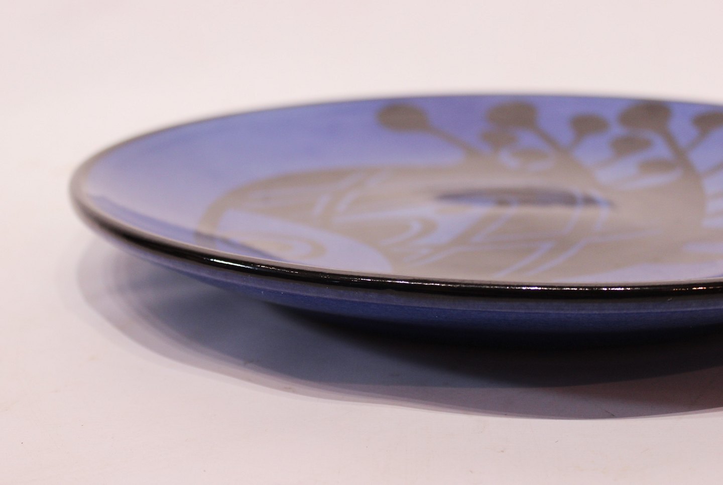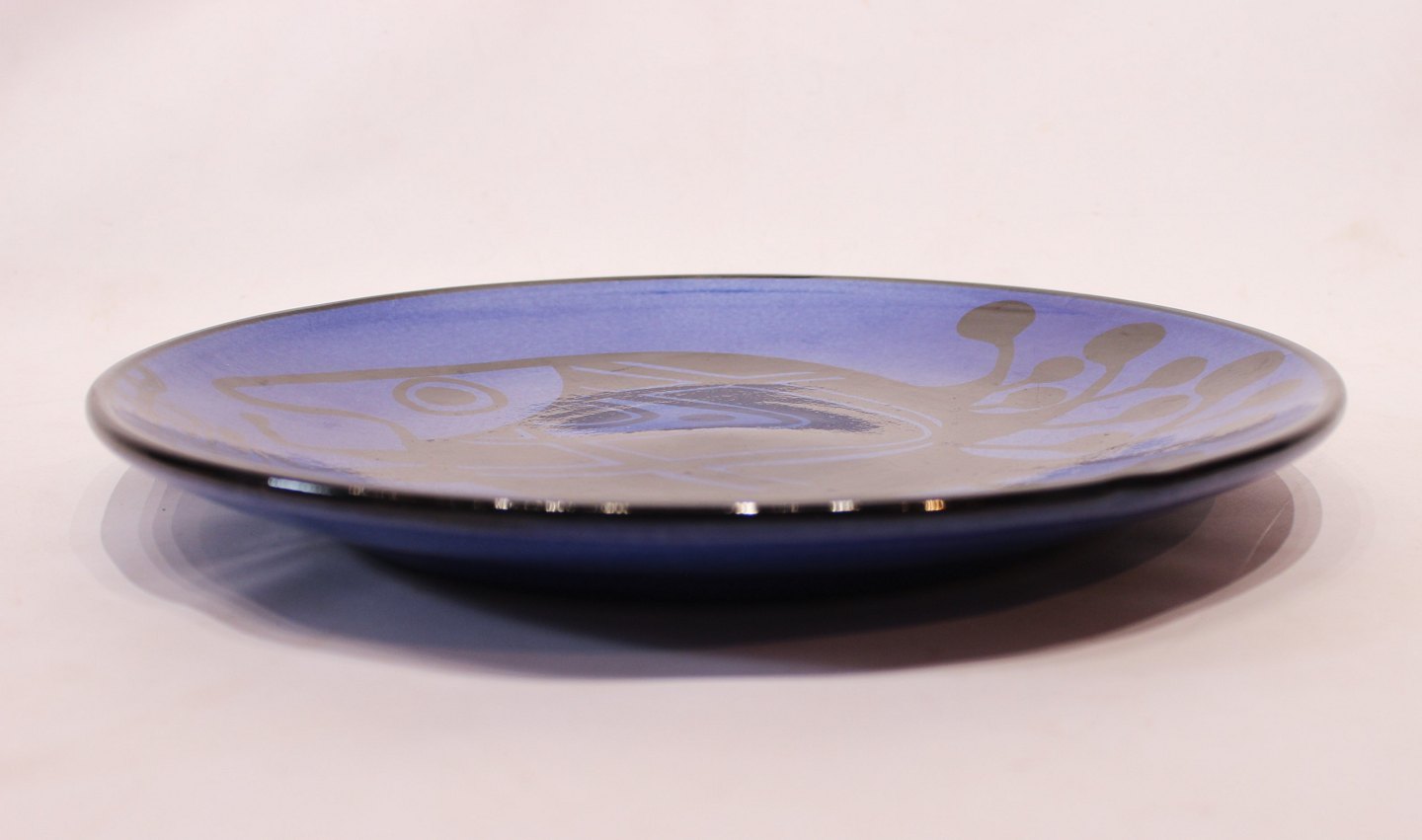 Stort rundt keramik fad med mørkeblå glasur og motiv af fisk, af Pottemagerstuen på Graabrødretorv 1. Fadet er i flot brugt stand.