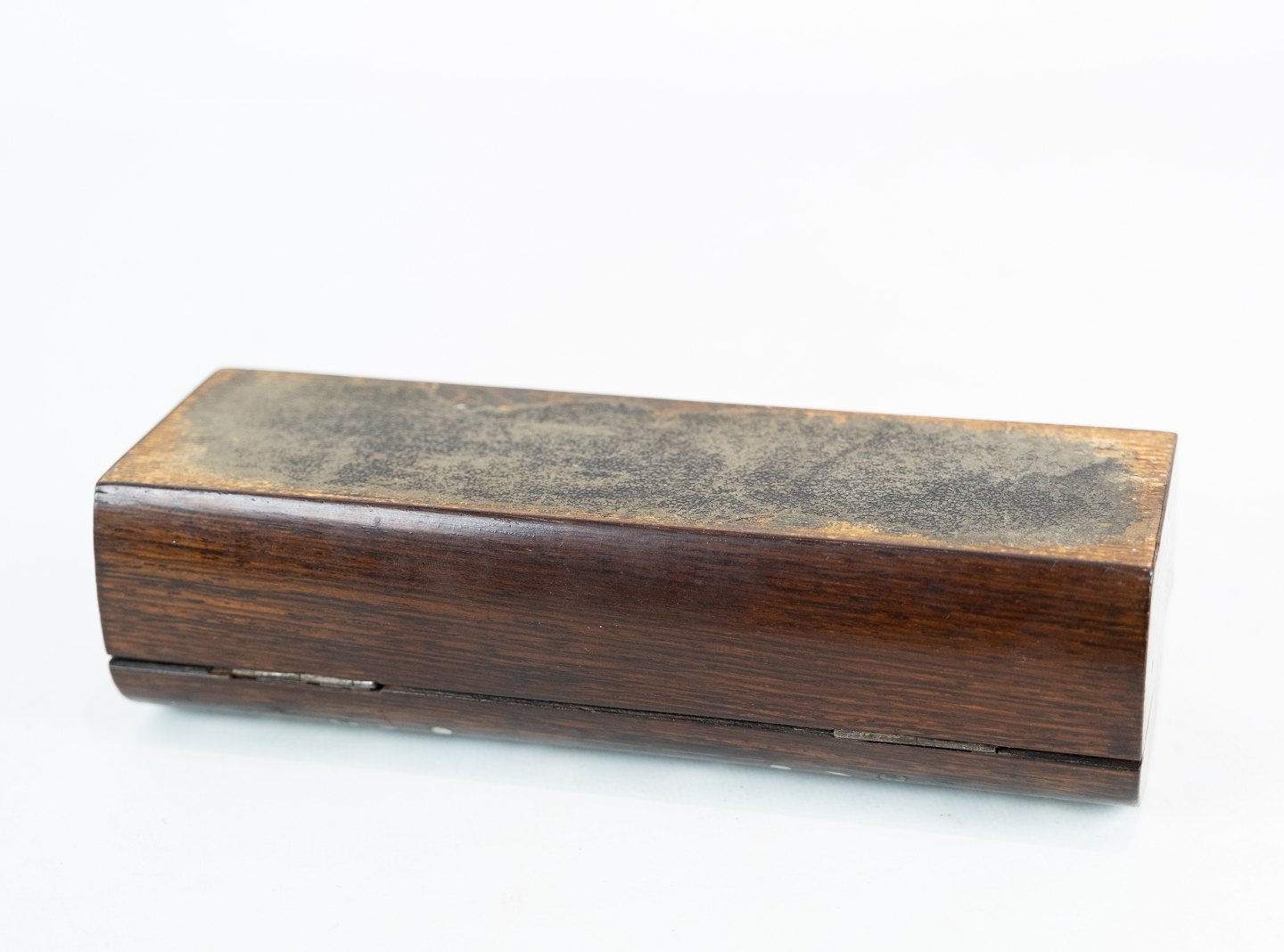 Mindre aflangt skrin i palisander udsmykket med perlemor. Skrinet er fra 1880erne.