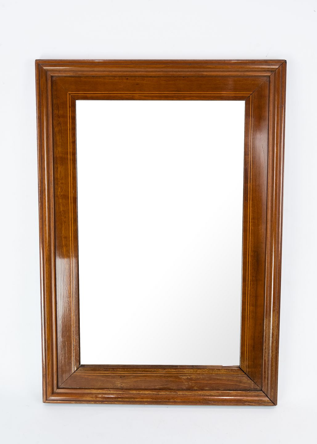 Spejl af håndpoleret valnød med intarsia fra 1880. Spejlet er i flot brugt stand.