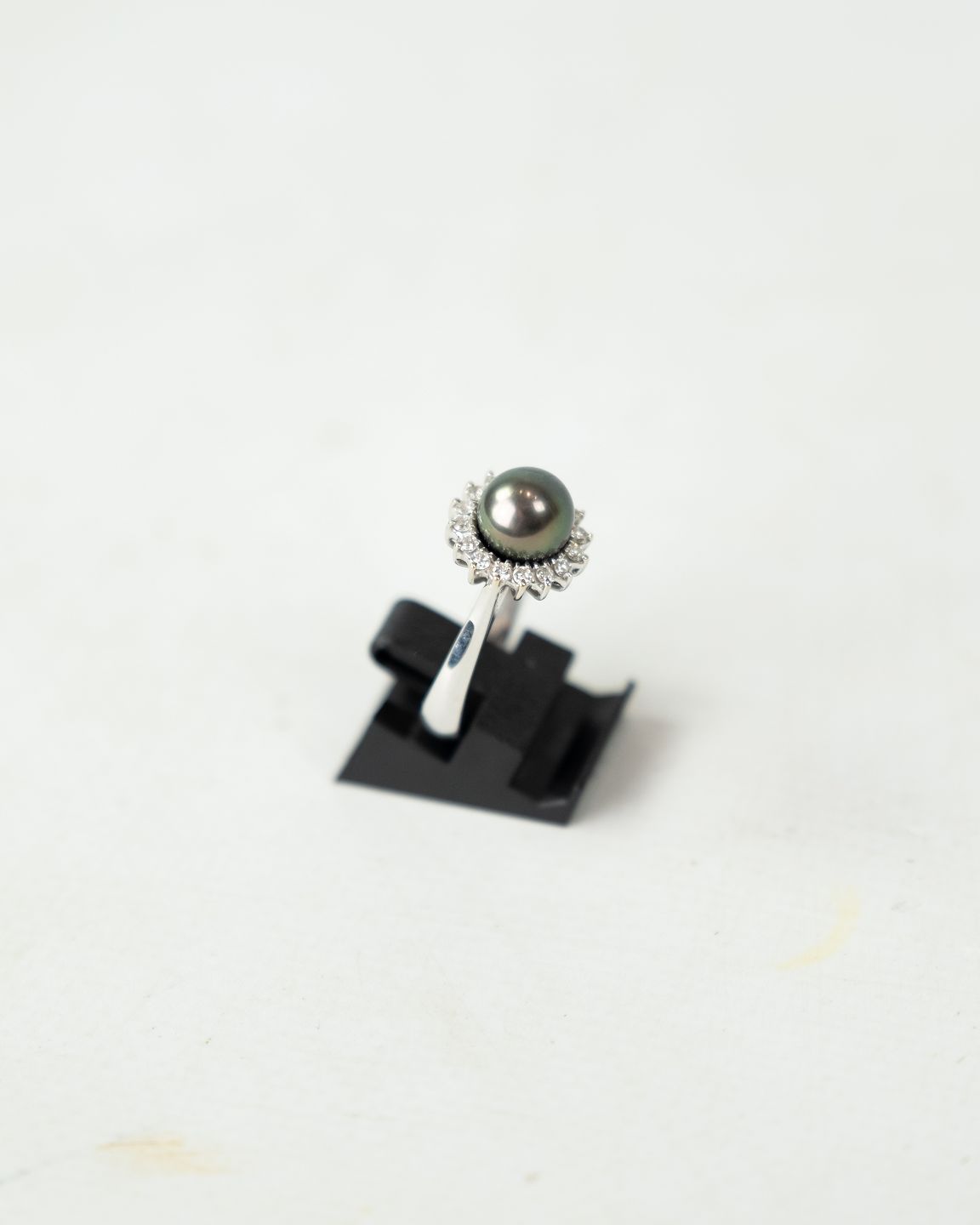 Ring i 18 kt. hvidguld med Tahiti perle omkranset af 15 diamanter.