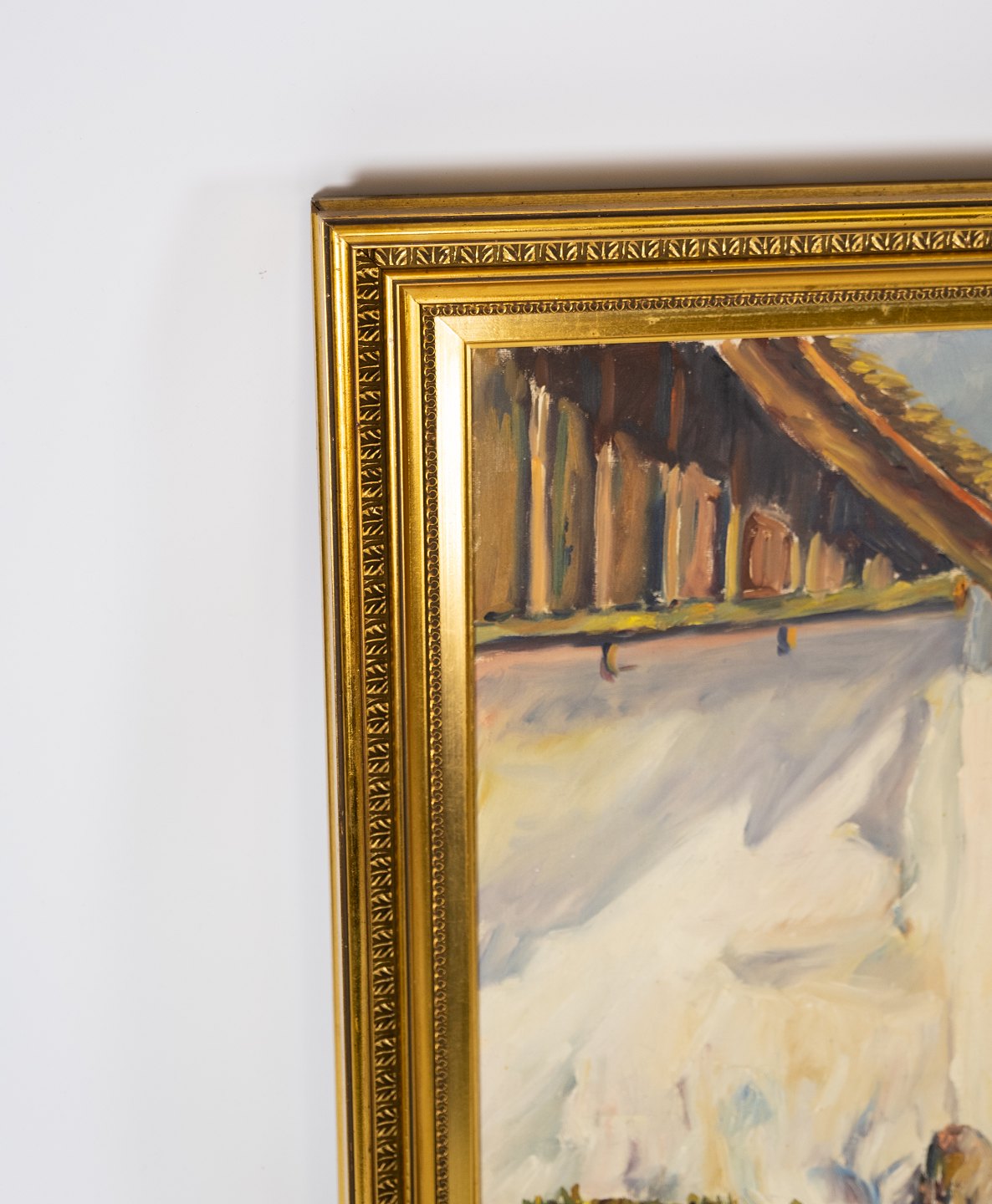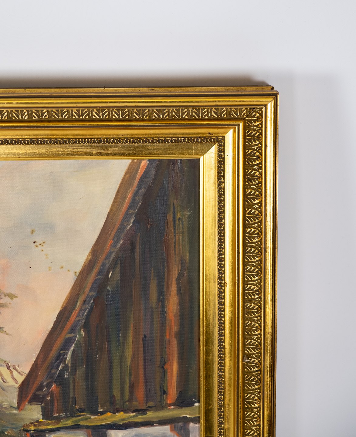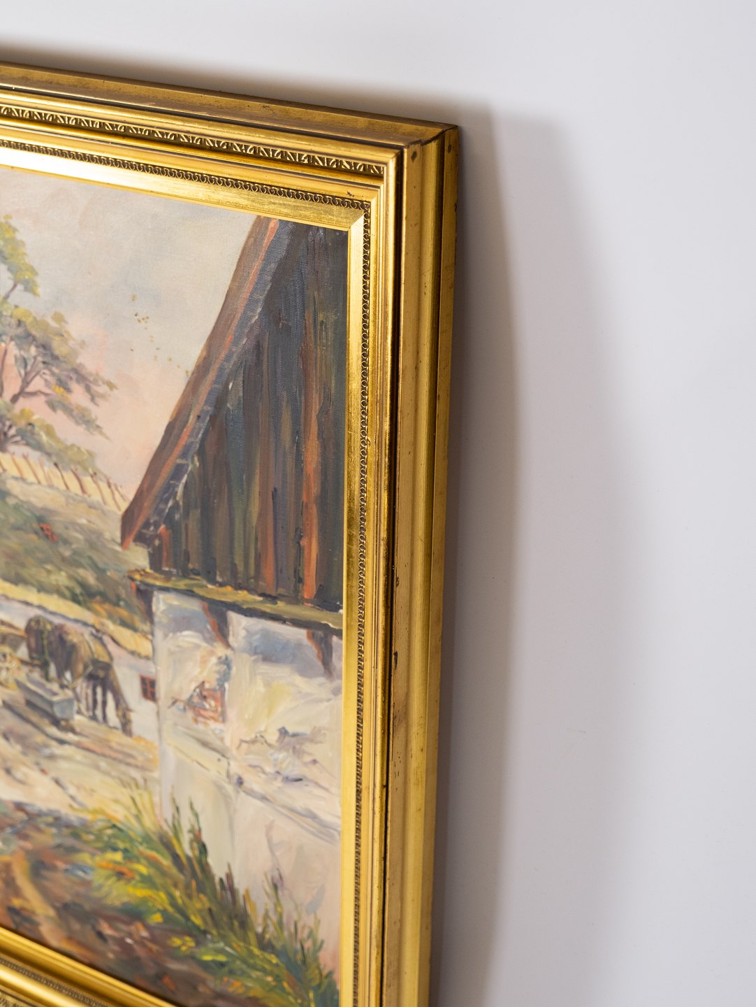 Oil painting with country motif and gilded frame, signed P.C. The painting is in great vintage condition.