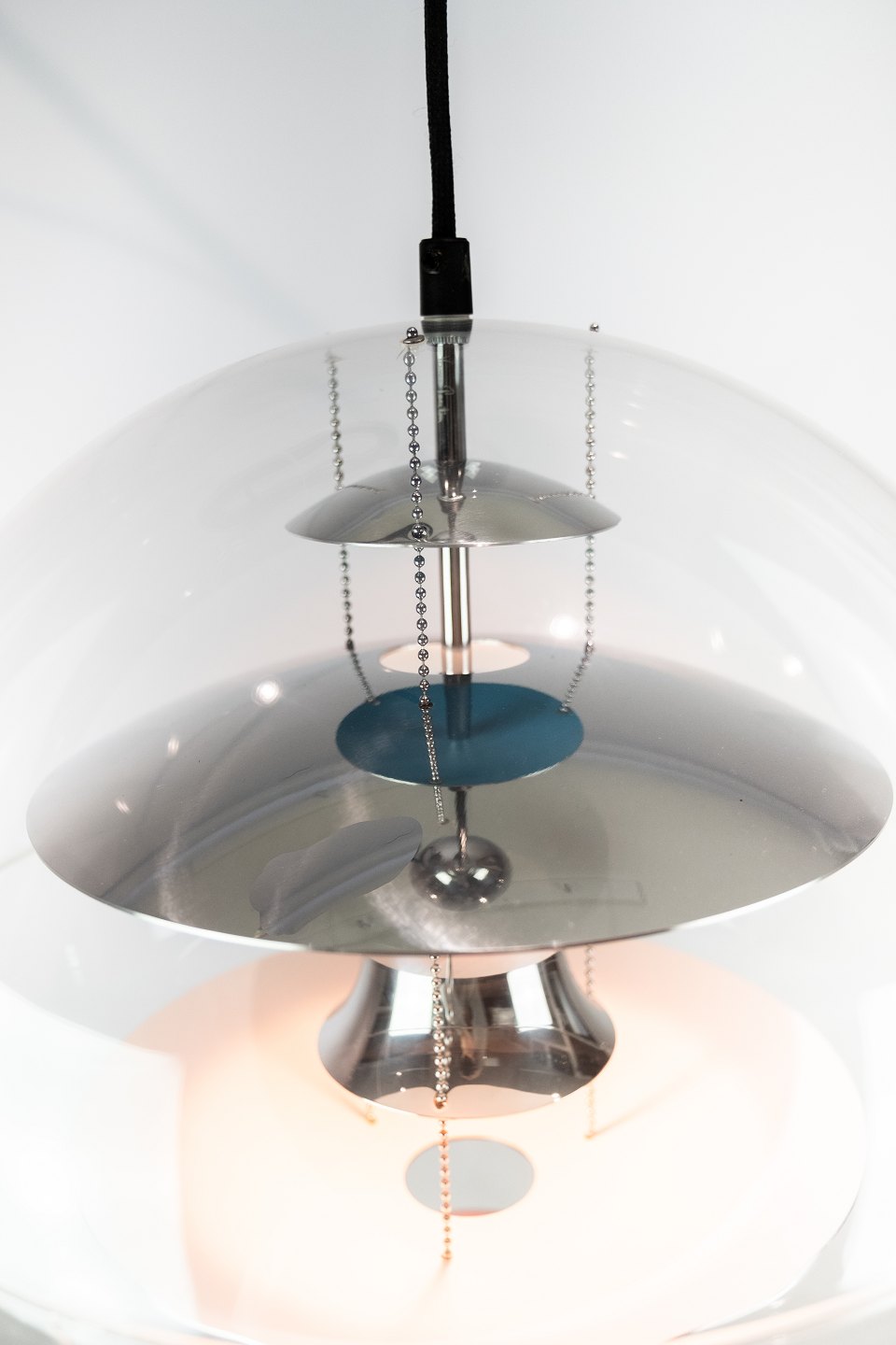 Globe, Ø40, designet af Verner Panton i 1969. Lampen er af transparent akryl med 5 ned hængte metal reflektorer, som er lakeret i hvid, rød og blå.