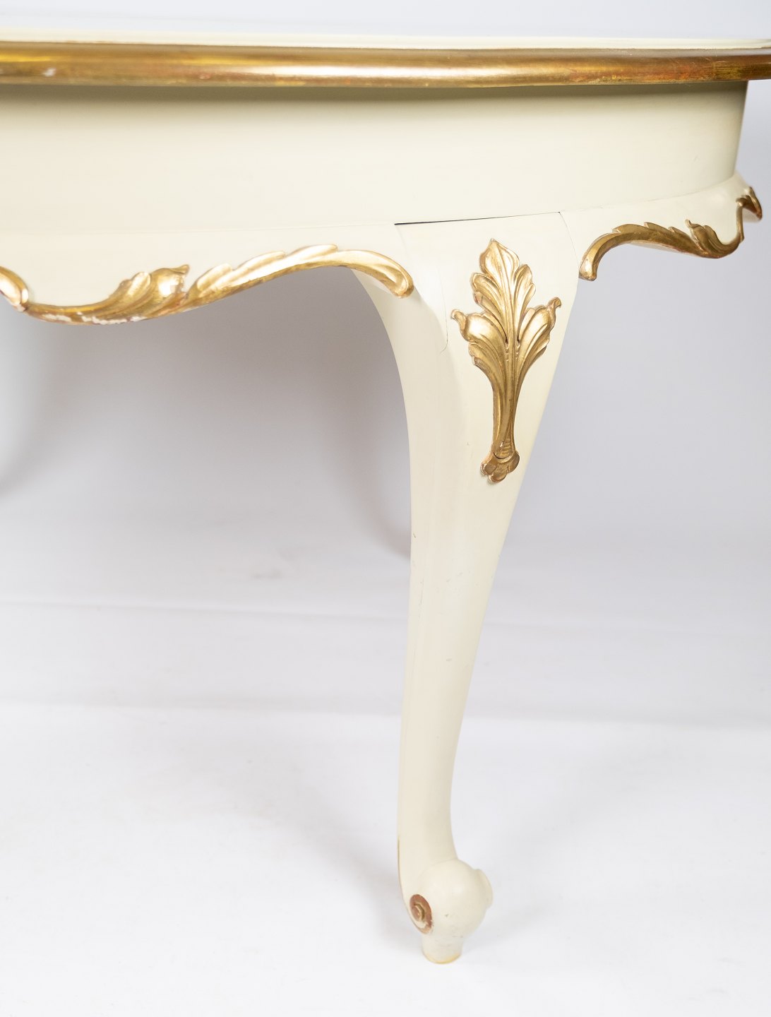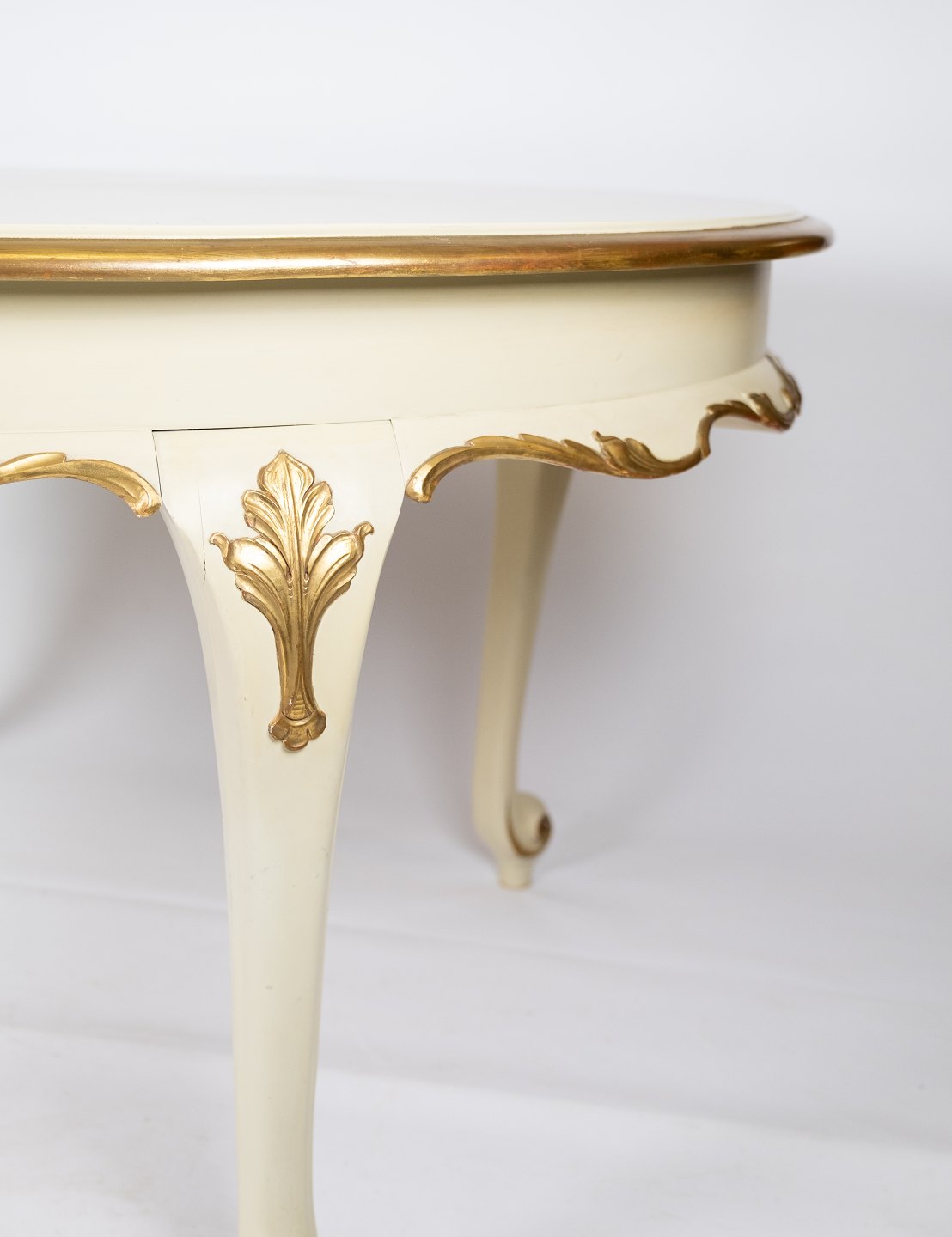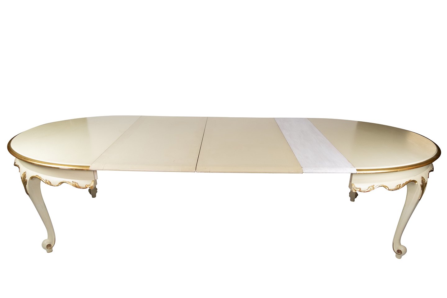 SolgtRokoko spisebord af hvid malet træ dekoreret med bladguld, og med tre udtræksplader fra 1890erne. Bordet er i flot brugt stand.