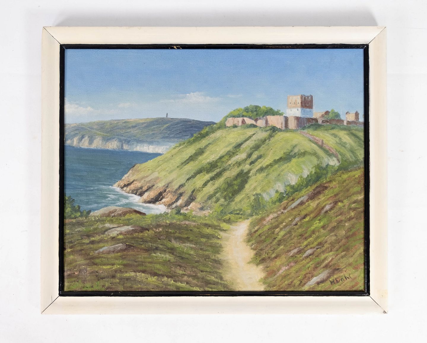 Oliemaleri på træplade med motiv af Hammerhus, Bornholm signeret H. Dahl fra 1930erne.