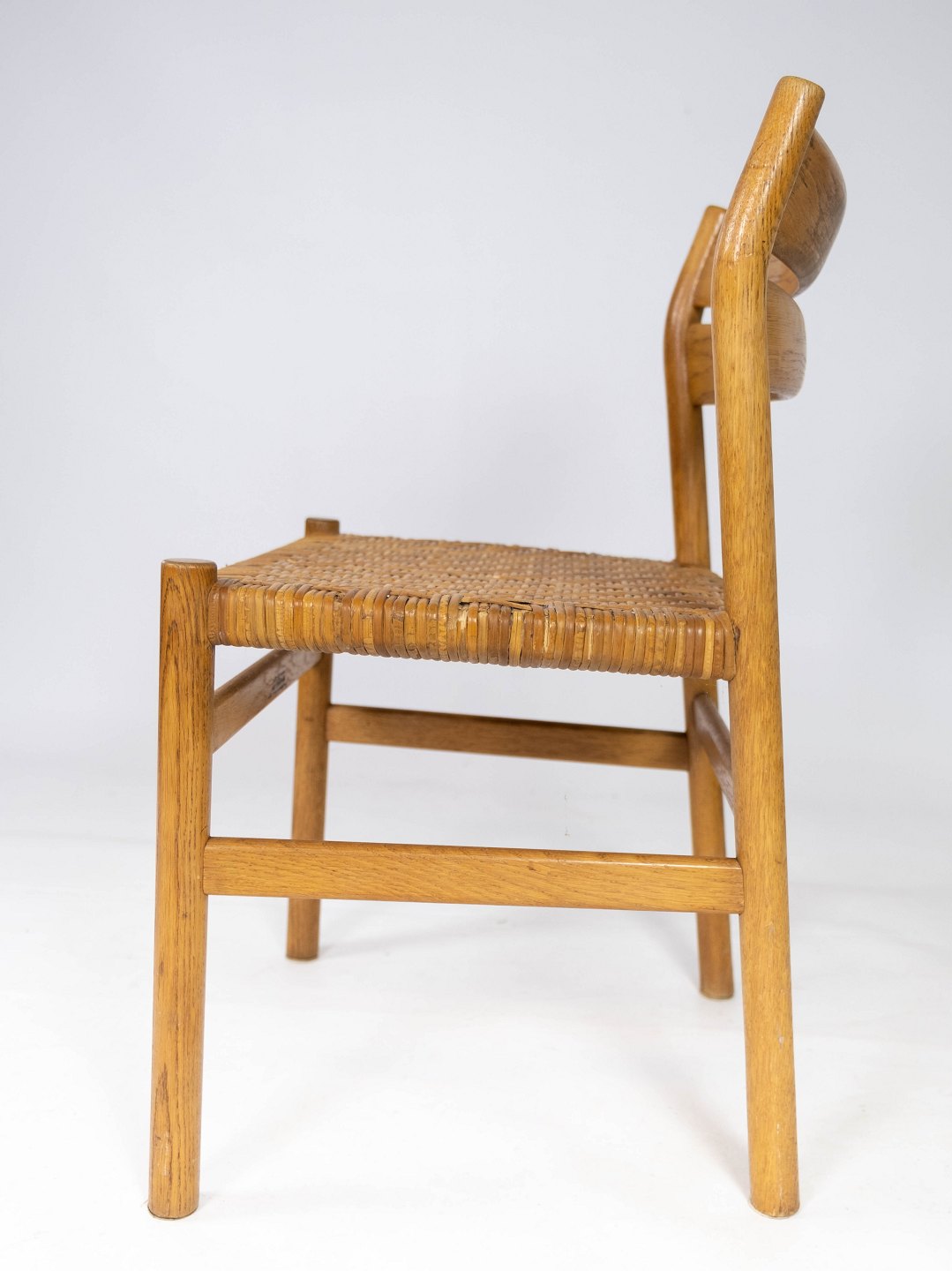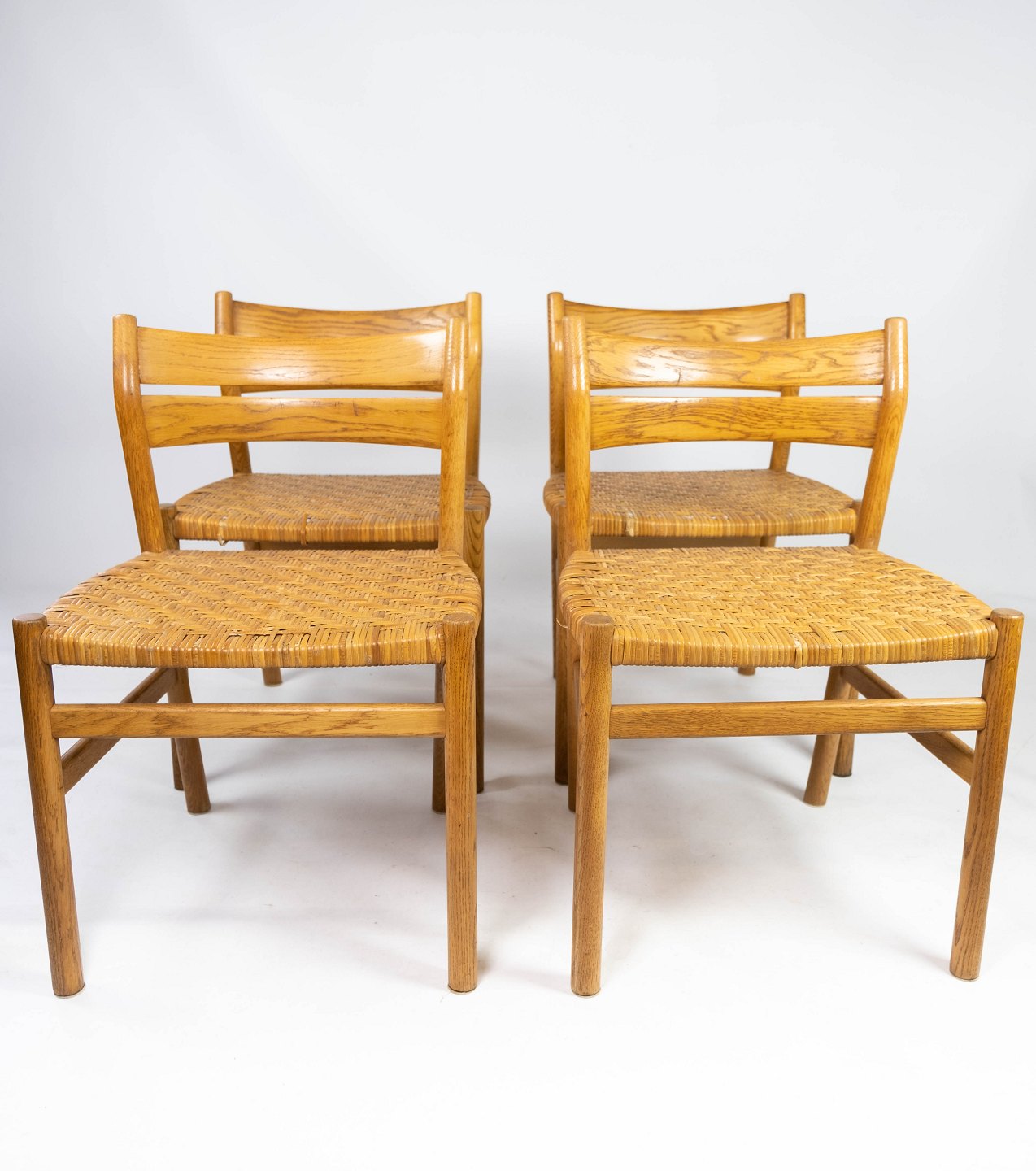 Et sæt af fire spisestuestole i egetræ og sæde i flet, designet af Børge Mogensen og fremstillet af Haaby Møbler i 1960erne.