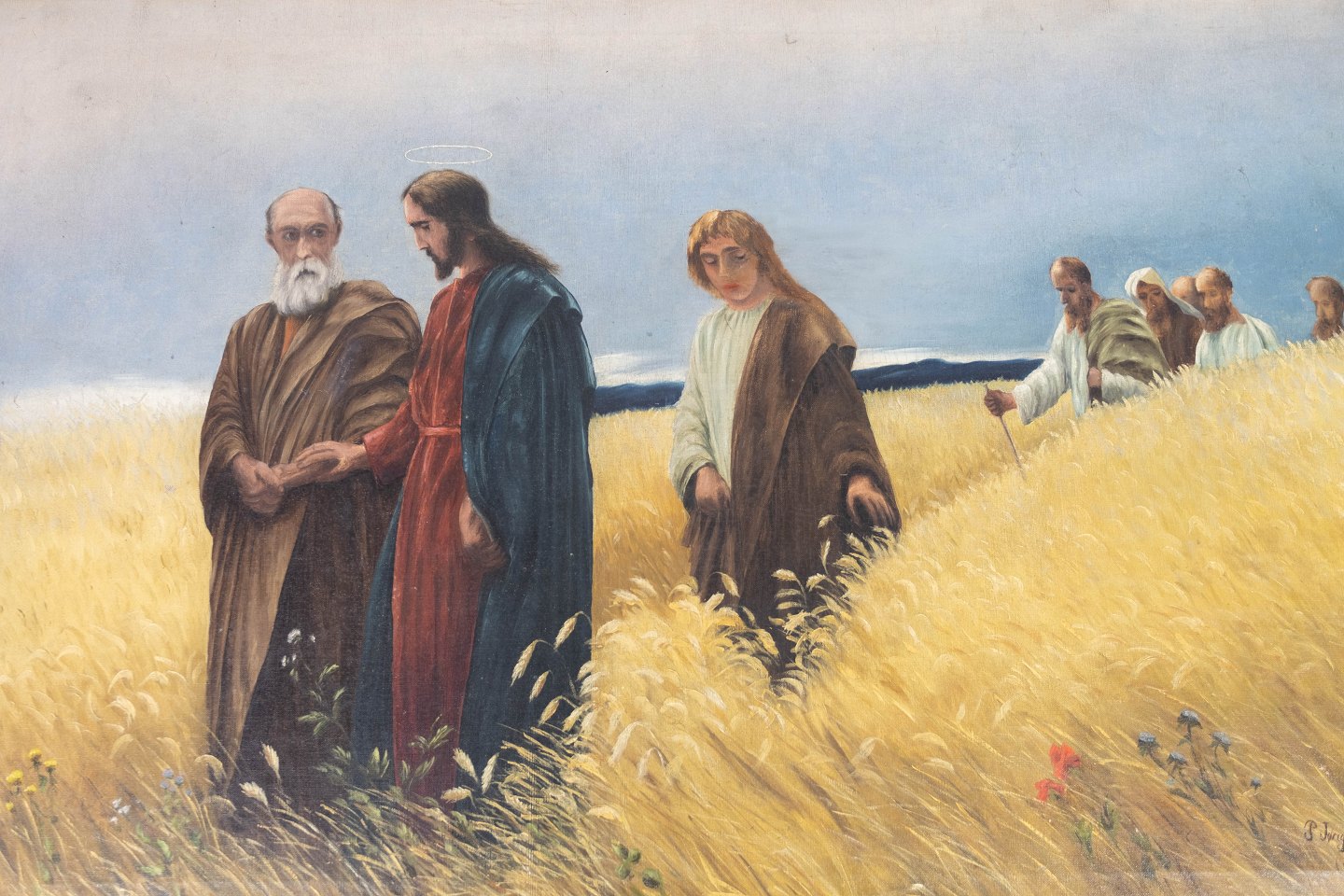 SoldOil painting with motif of Jesus Christ and with gilded frame, signed B. Jørgensen 1921.