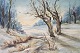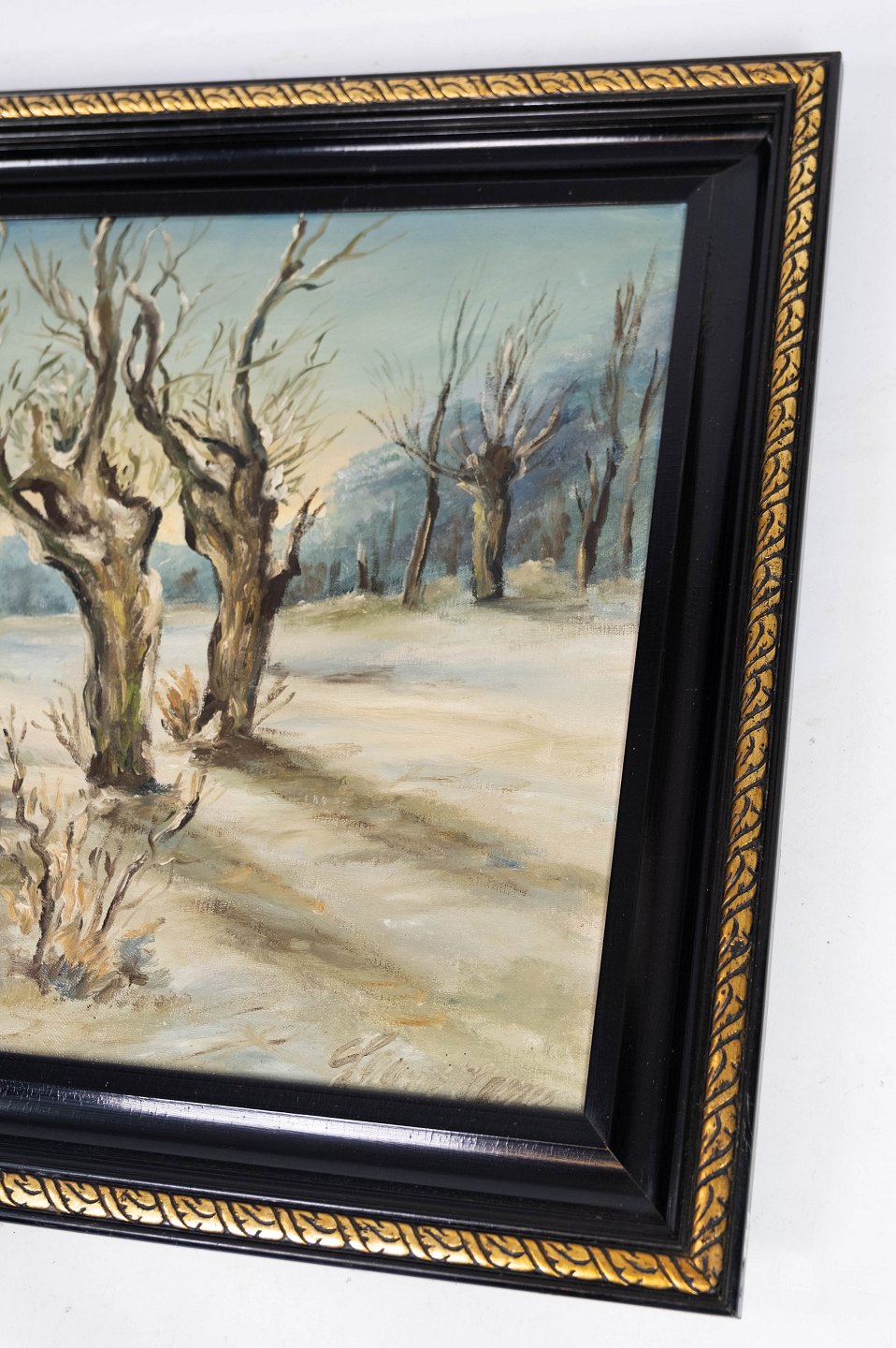 Oliemaleri med vintermotiv og sort malet ramme, med ukendt signatur fra 1920erne.