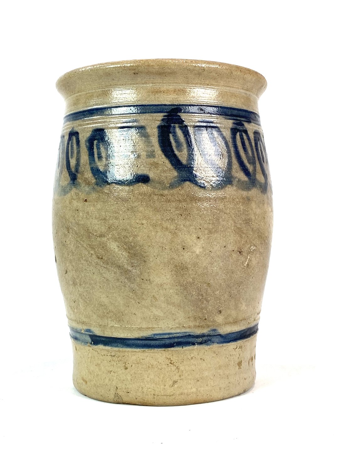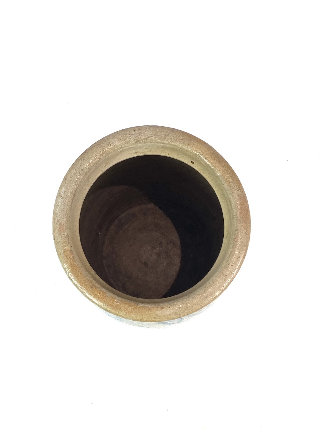 Grå keramik vase eller krukke med blåt mønstre fra 1930erne.
