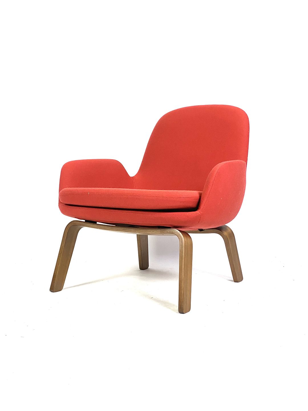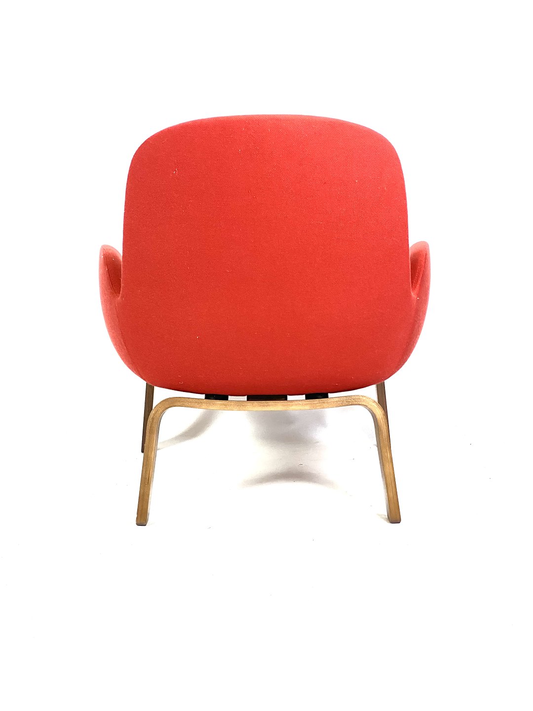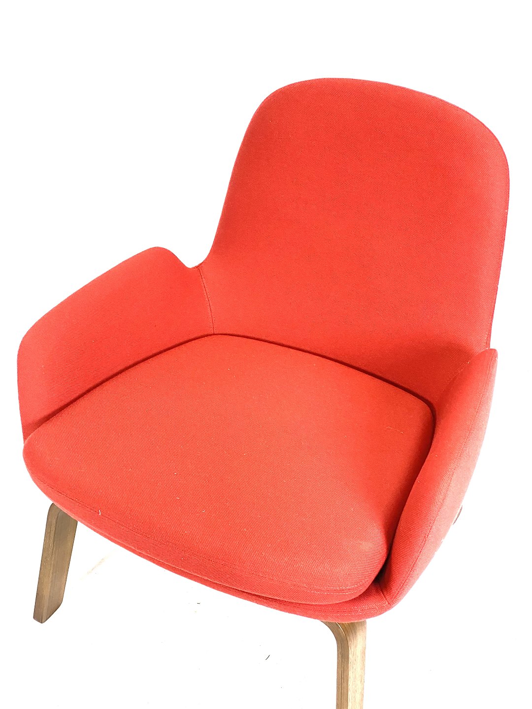 Lænestol med ben af valnød og polstret med rødt stof af dansk design for Normann Copenhagen. Stolen er i flot brugt stand.