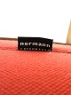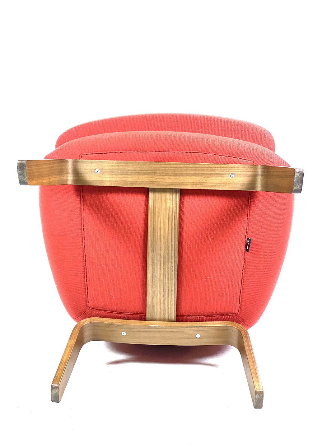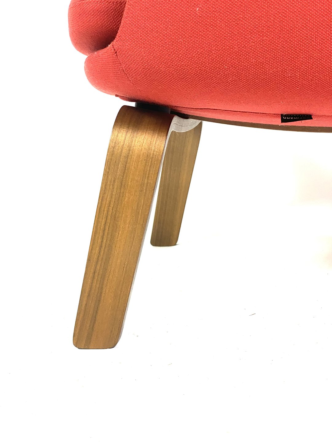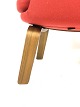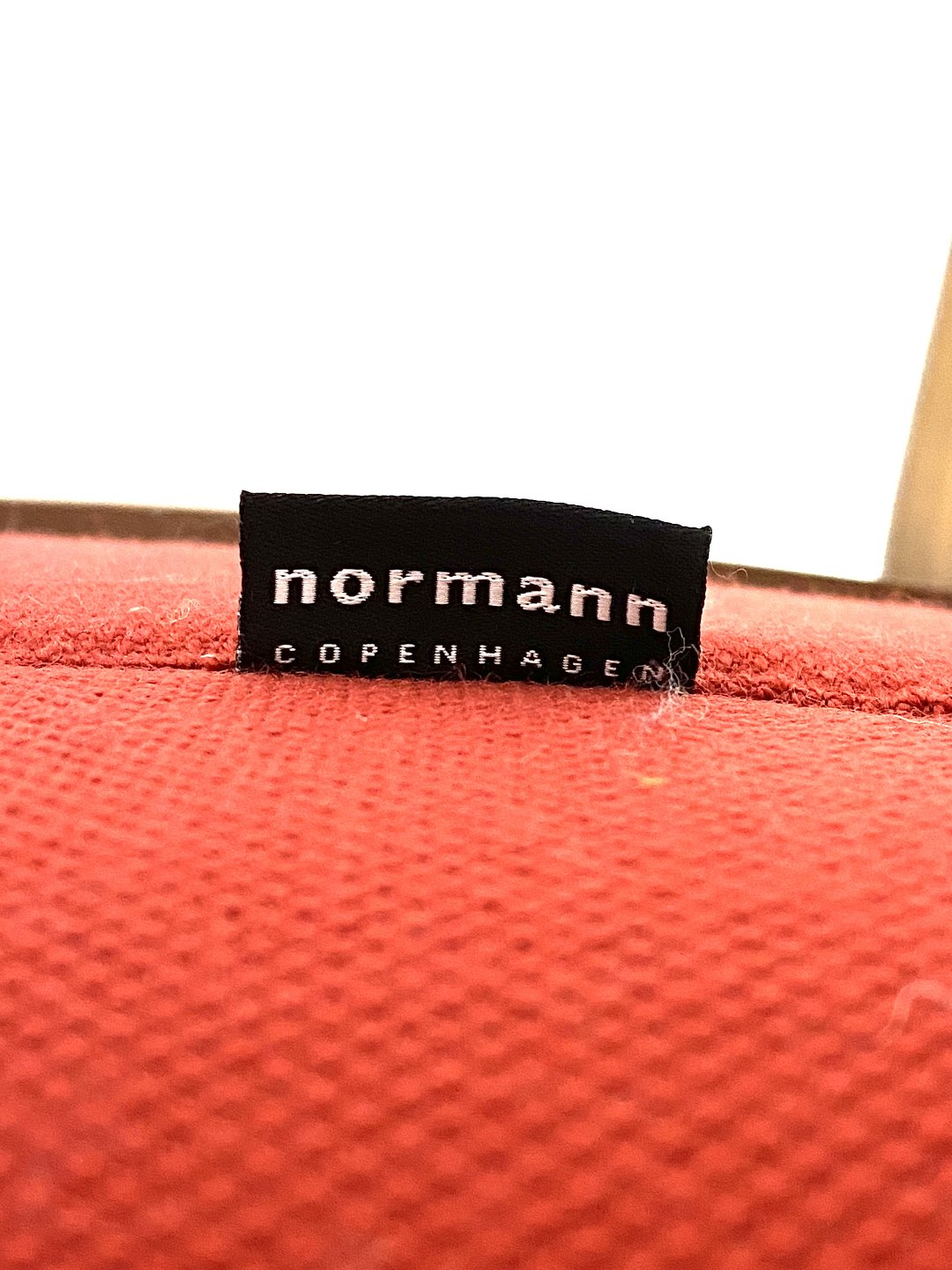 Lænestol med ben af valnød og polstret med rødt stof af dansk design for Normann Copenhagen. Stolen er i flot brugt stand.