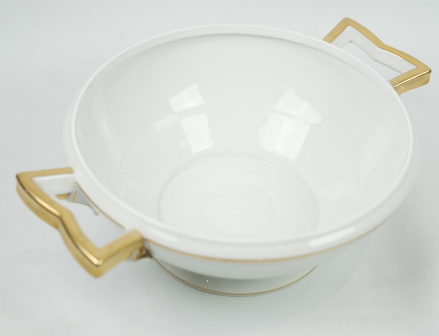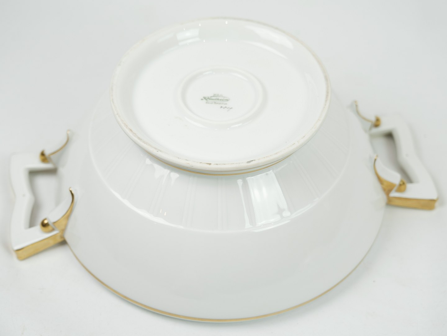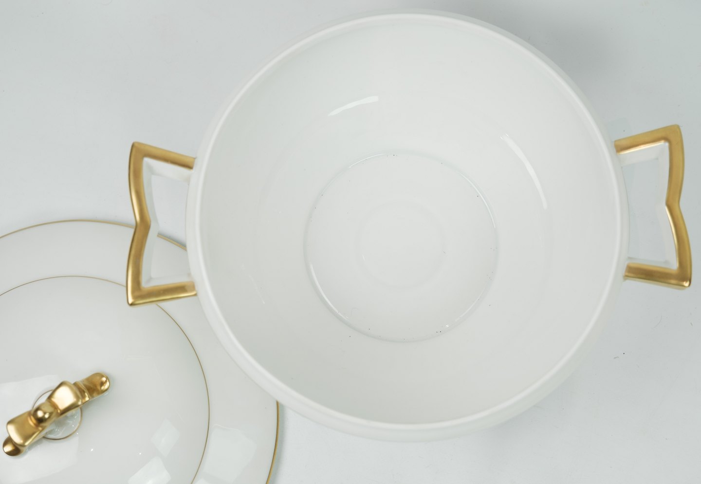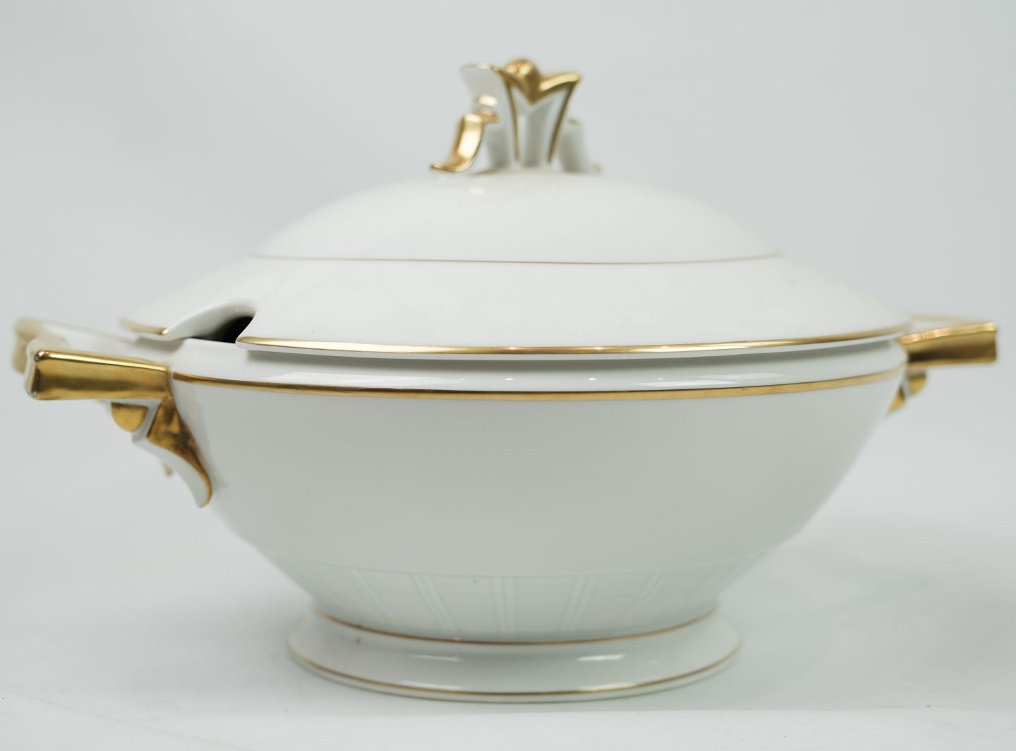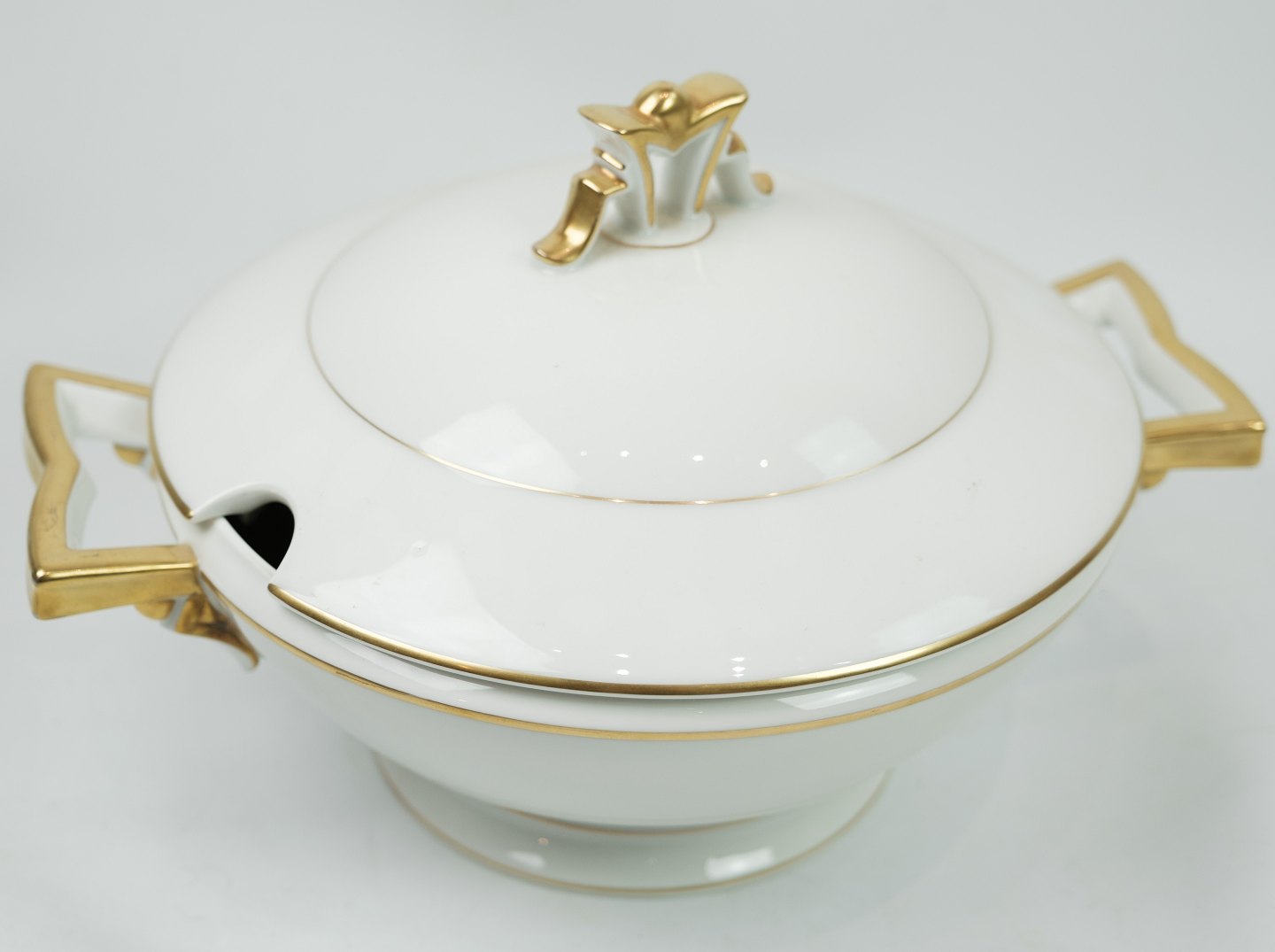 Large soup tureen from porcelain factory Hautheim, model 7800. Stands super nice in gold in fine used condition.