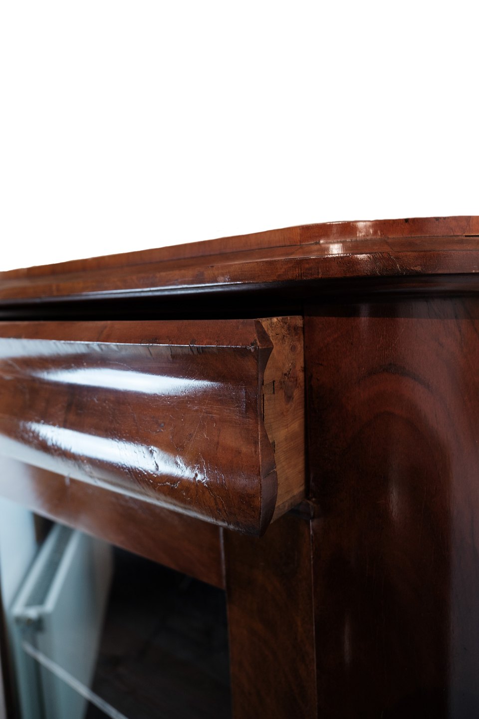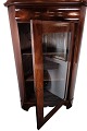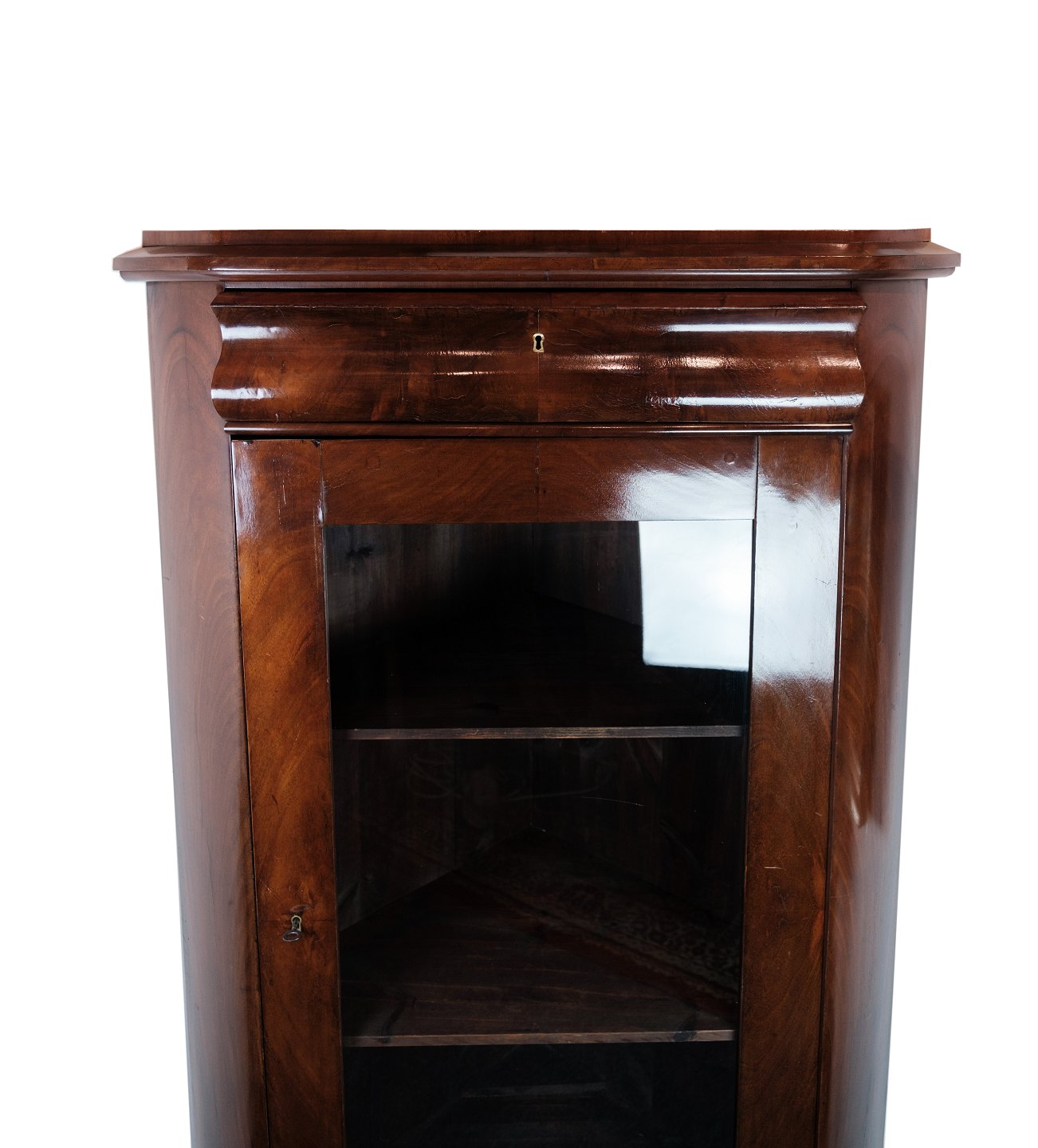 Det antikke senempire hjørneskab med hylder i mahogni fra 1840'erne er et imponerende stykke møbelhistorie, der udstråler elegance og tidløs skønhed. Hjørneskabet er et smukt eksempel på den håndværksmæssige dygtighed og fine design, der kendetegner senempire-stilen.