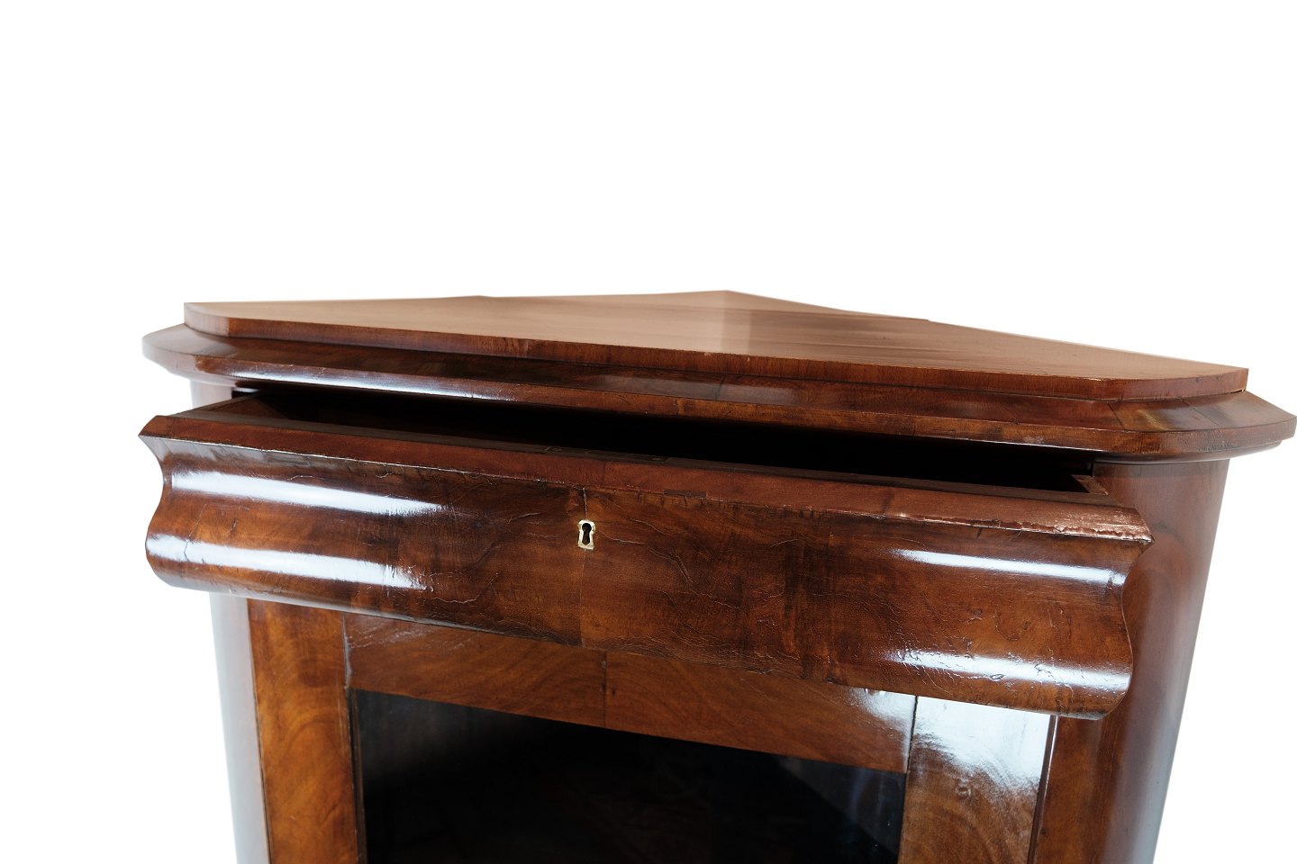Udført i mahogni, en træsort kendt for sin varme farve og rige mønstre, har dette hjørneskab en fortryllende udstråling. Den omhyggeligt udformede ramme og dekorative elementer tilføjer en luksuriøs følelse og klassisk elegance til ethvert rum.