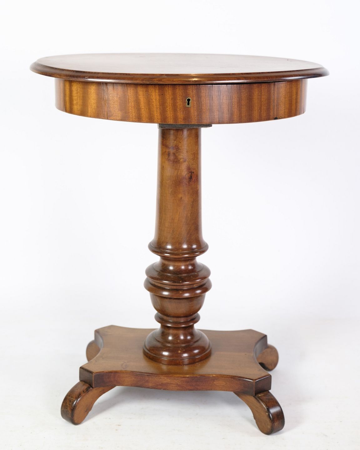 Ovalt sybord / lampebord på søjle med syrum i mahogni fra omkring 1890'erne.