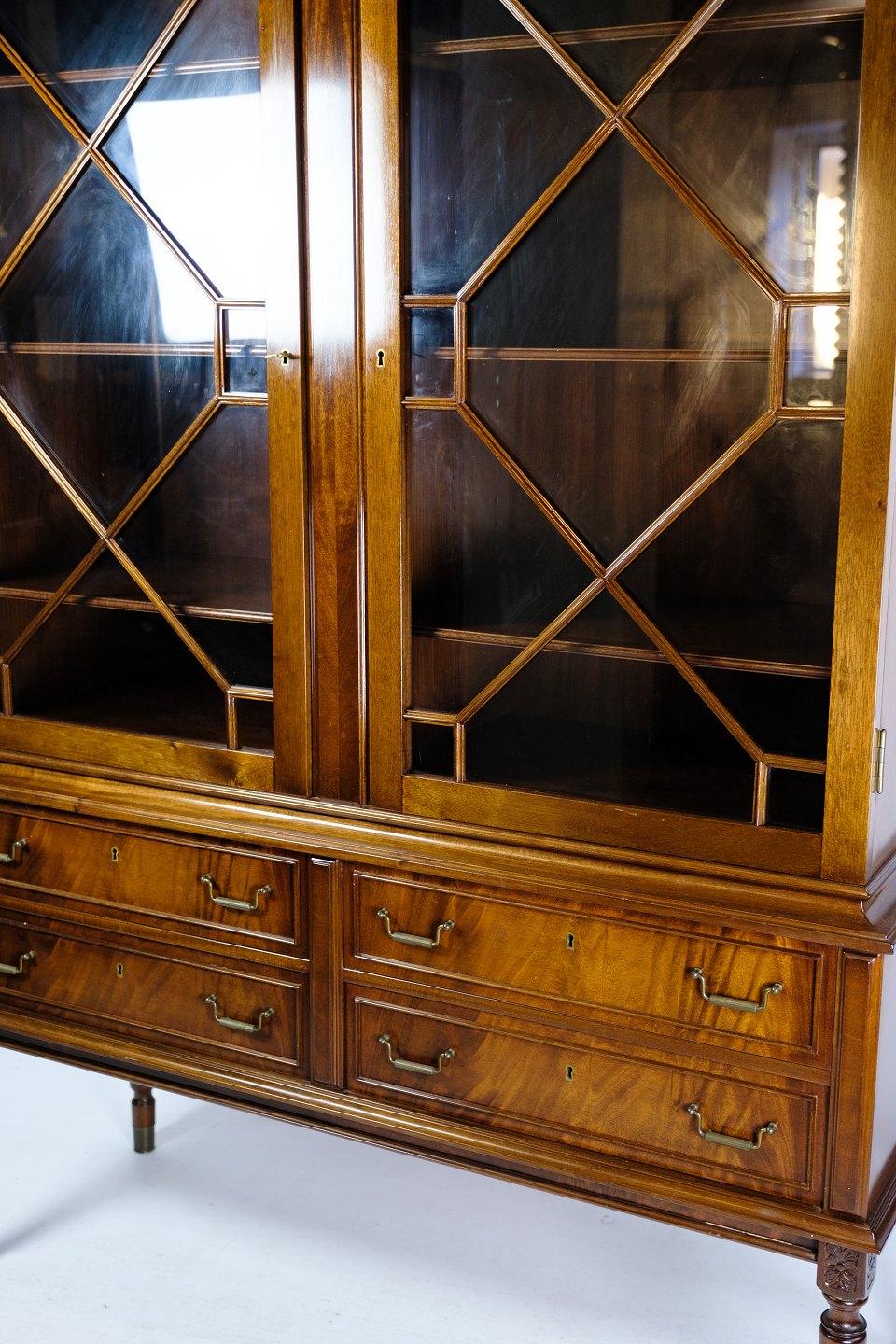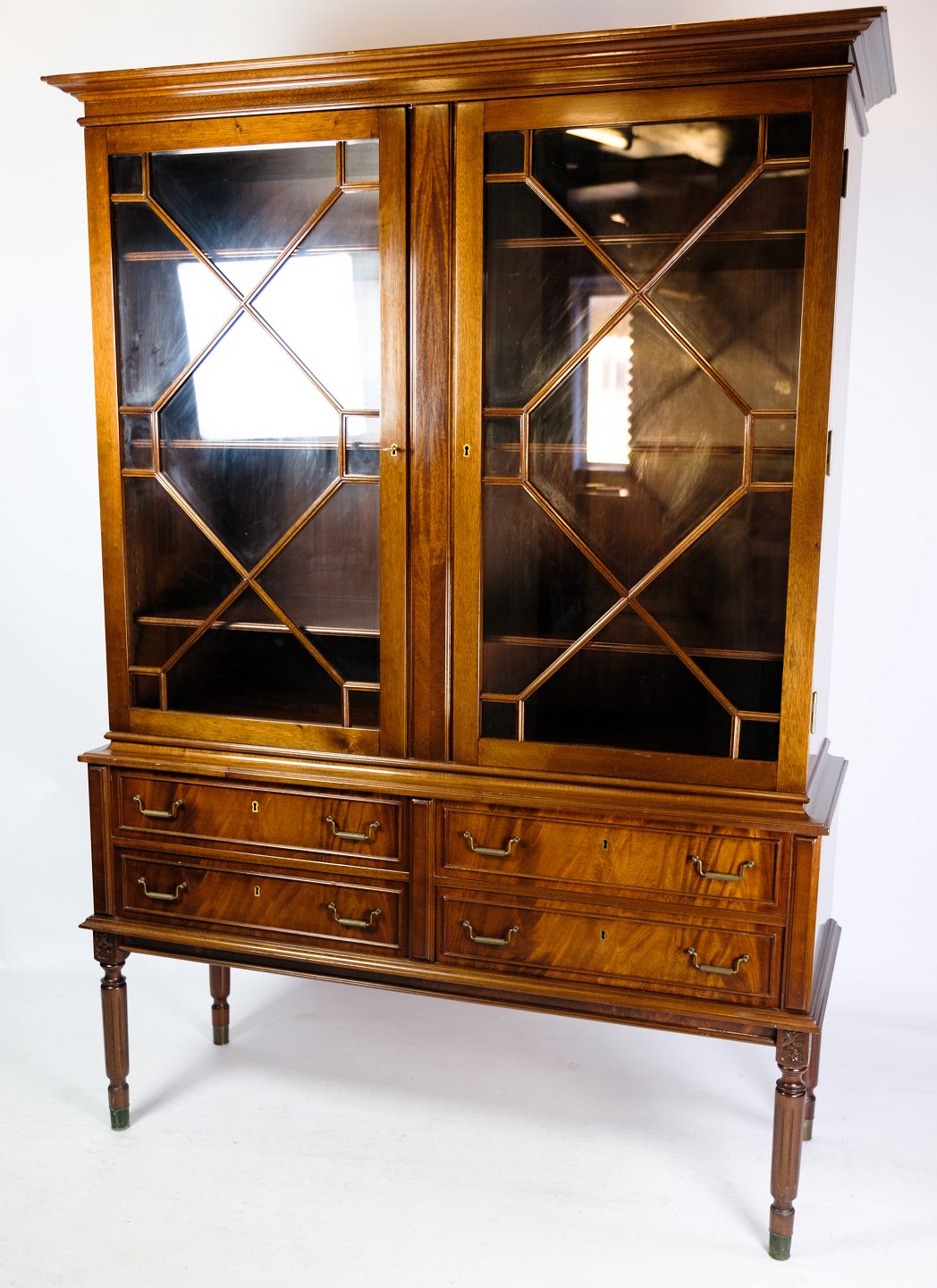 SolgtDette Hepplewhite-stil vitrineskab i mahogni, produceret af Farre Jensen omkring 1960'erne, udstråler elegance og tidløs skønhed.