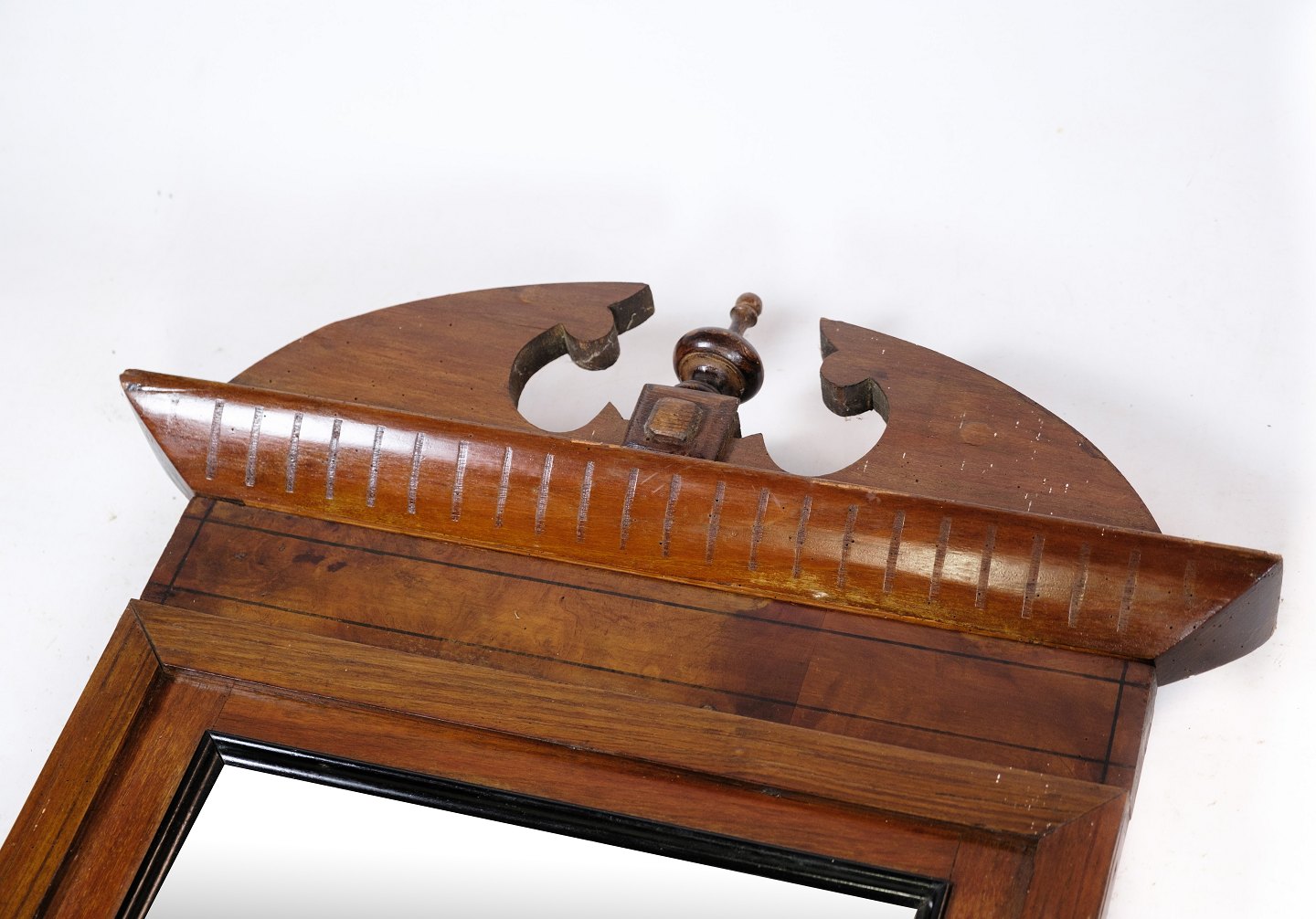 Spejl af hånd poleret mahogni, med udskæringer, lavet i Danmark fra omkring 1880'erne