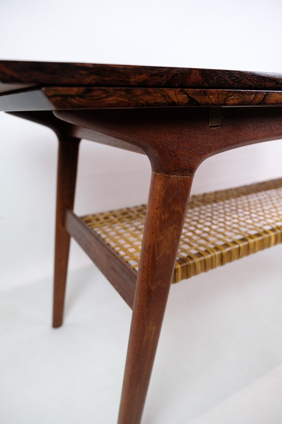 SoldCoffee table in rosewood by Heltborg Møbler Denmark with underlying wicker hearth from around the 1960s. The coffee table also has pull-out plates on each side, which make it 47 cm and 87 cm wide respectively.