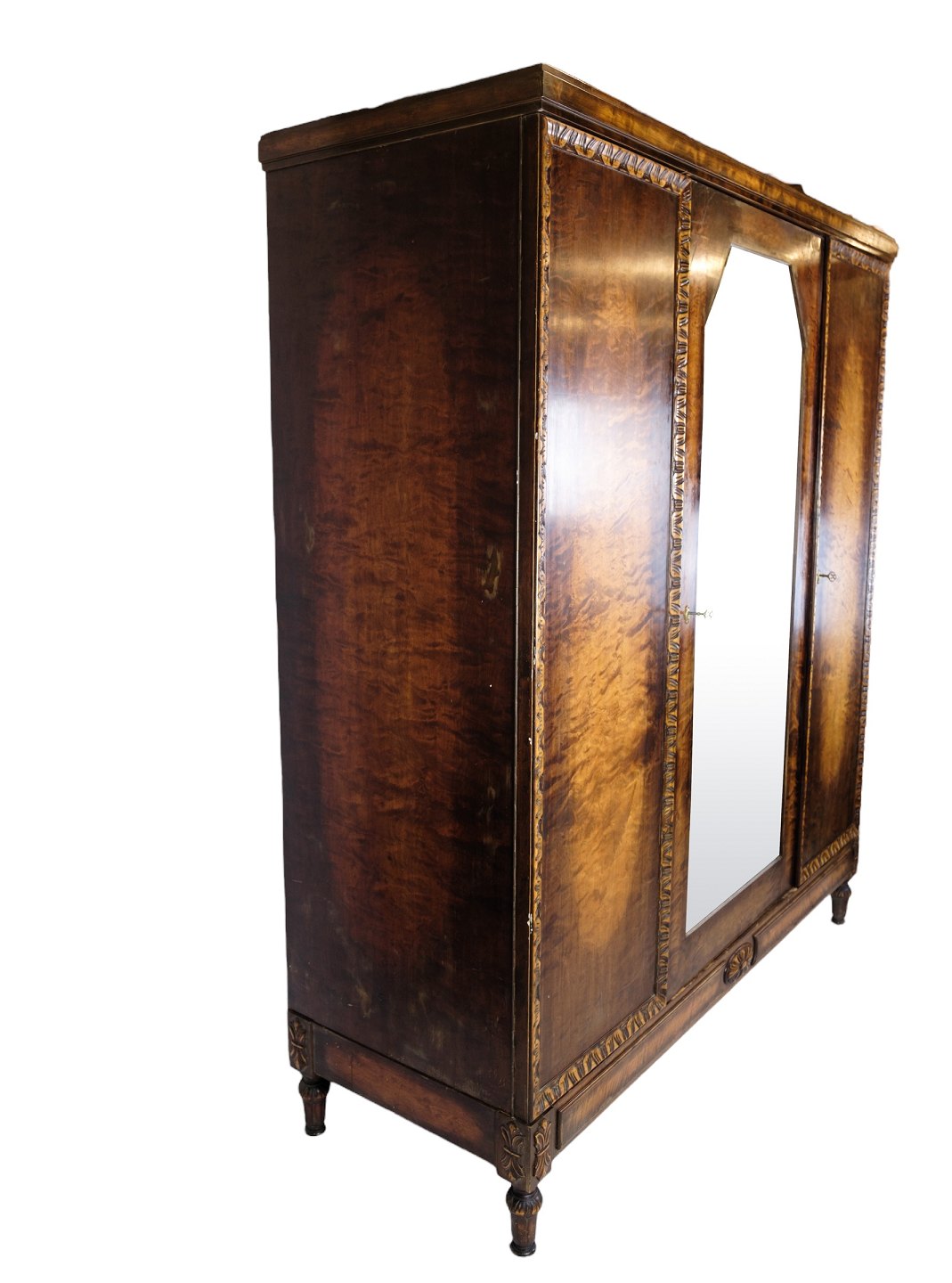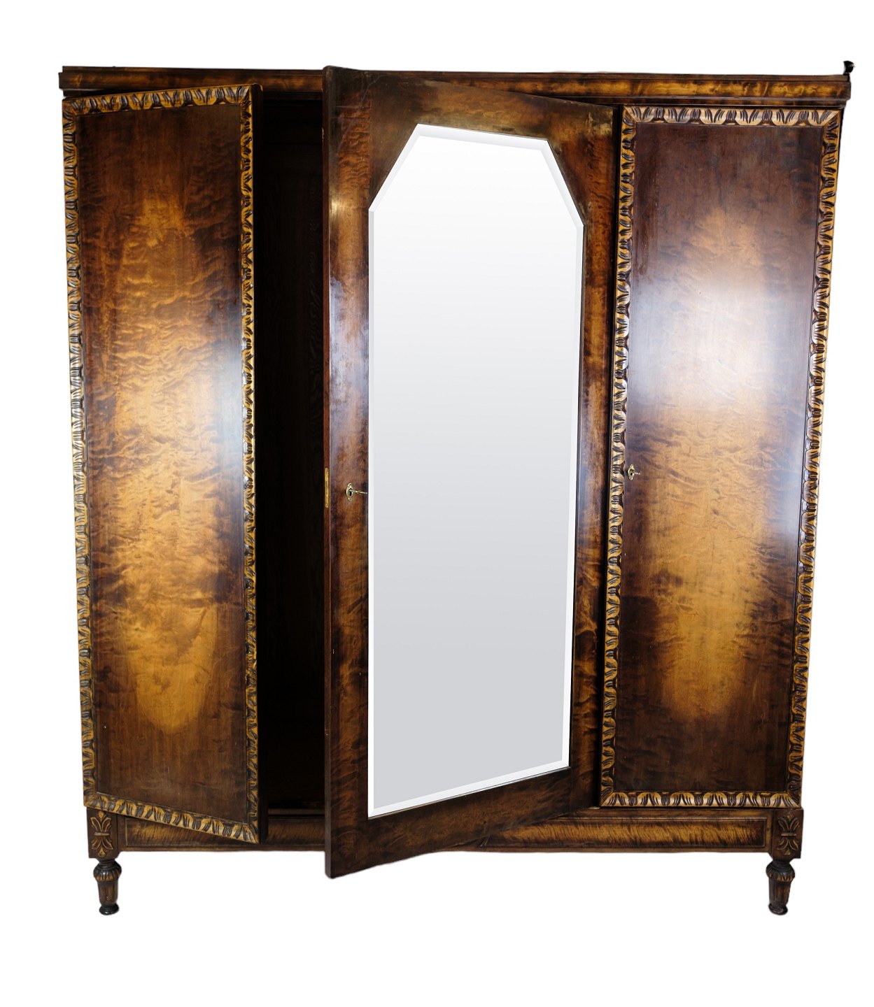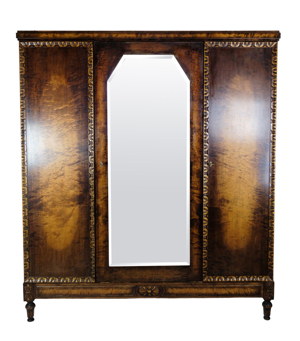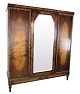 SolgtKlædeskab i poleret birketræ med facetslebet spejl i midten og 3 låger og hylder fra omkring år 1930'erne.