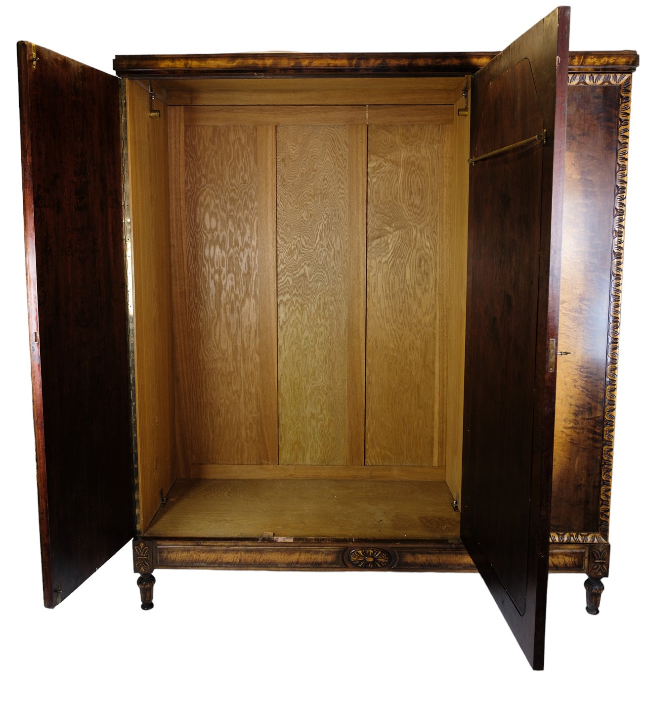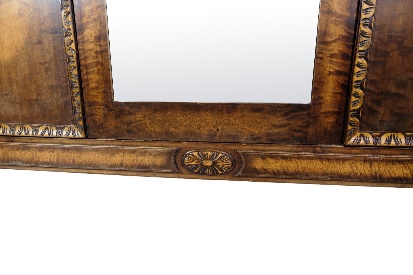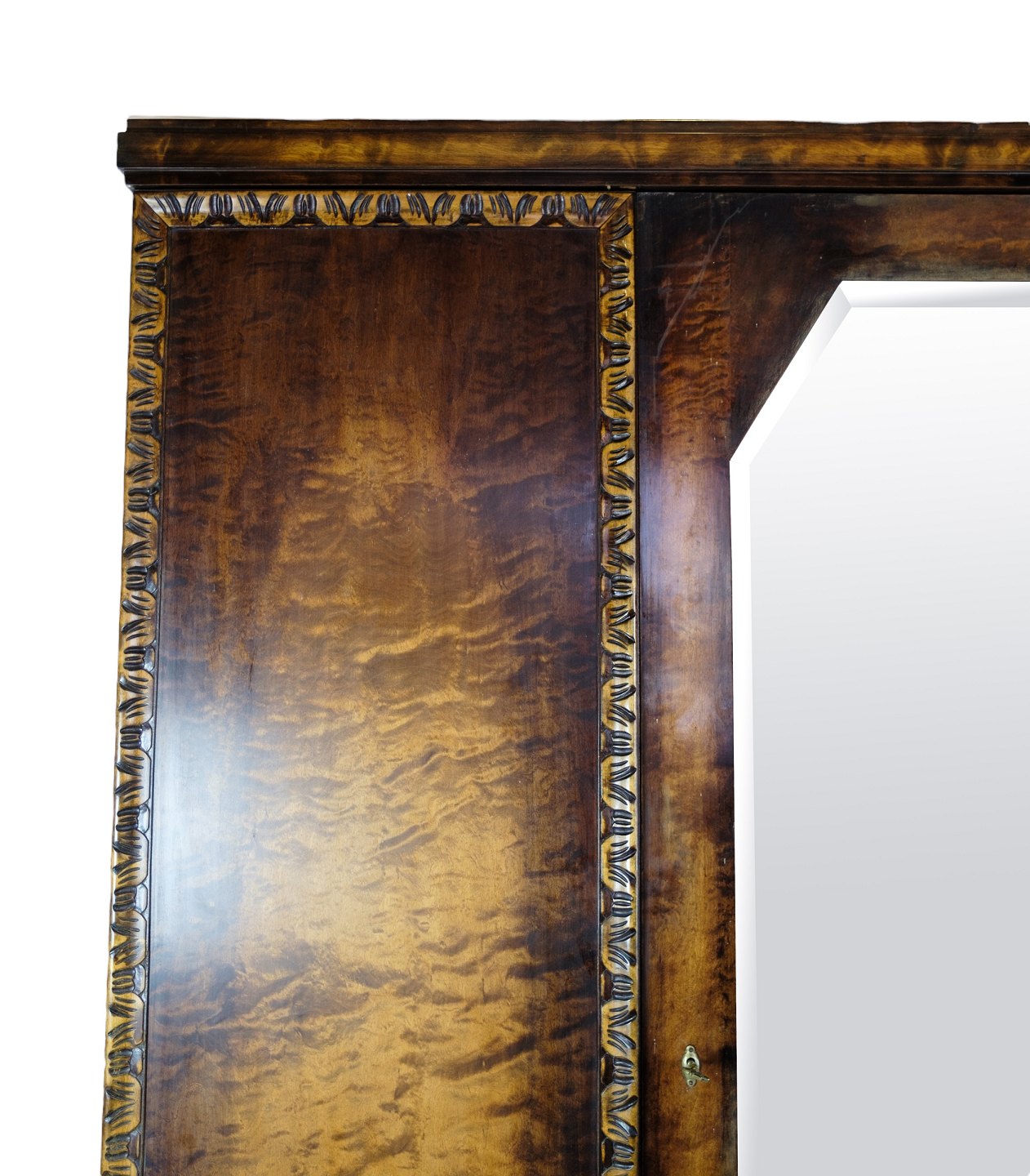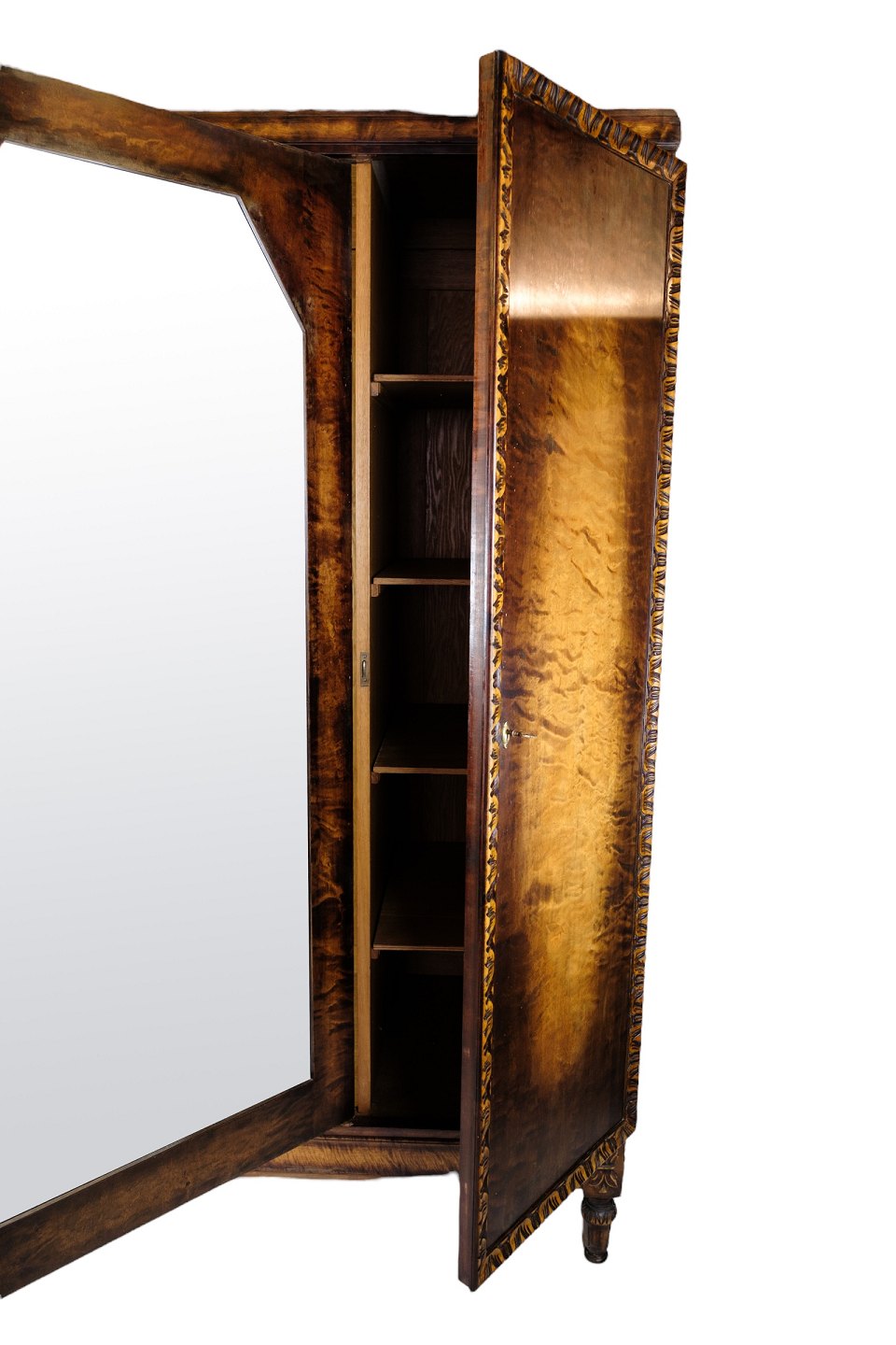 SolgtKlædeskab i poleret birketræ med facetslebet spejl i midten og 3 låger og hylder fra omkring år 1930'erne.