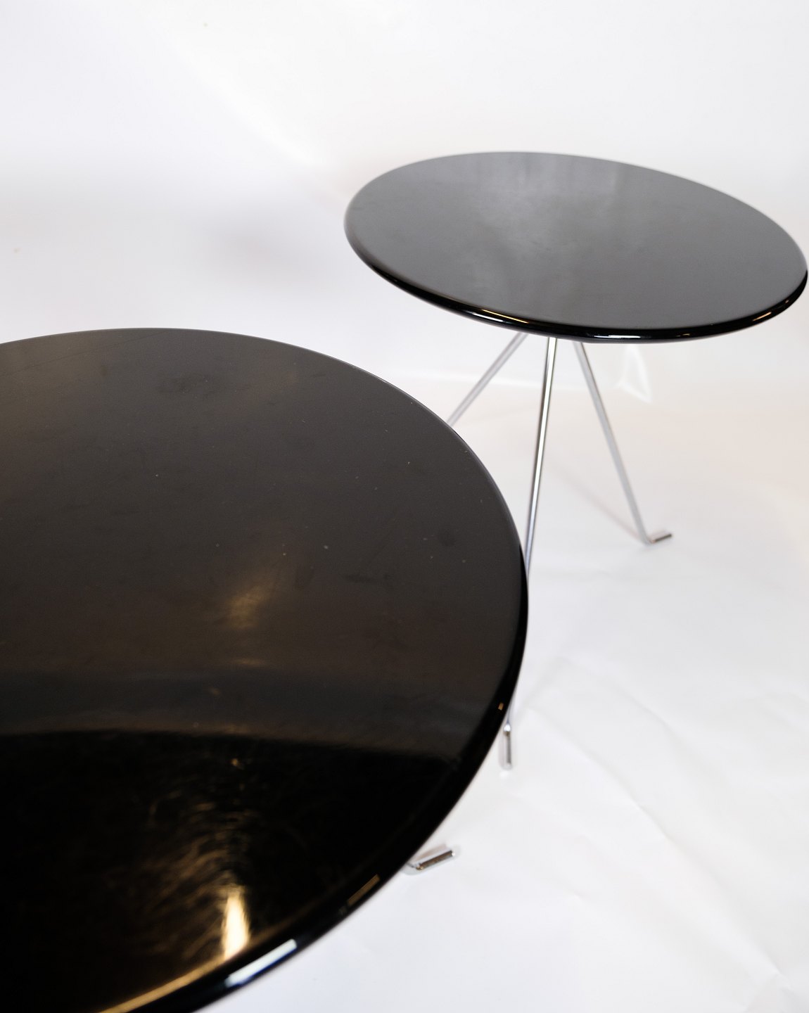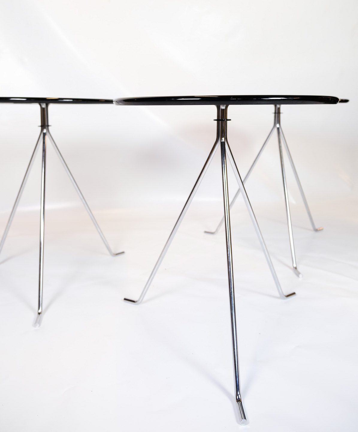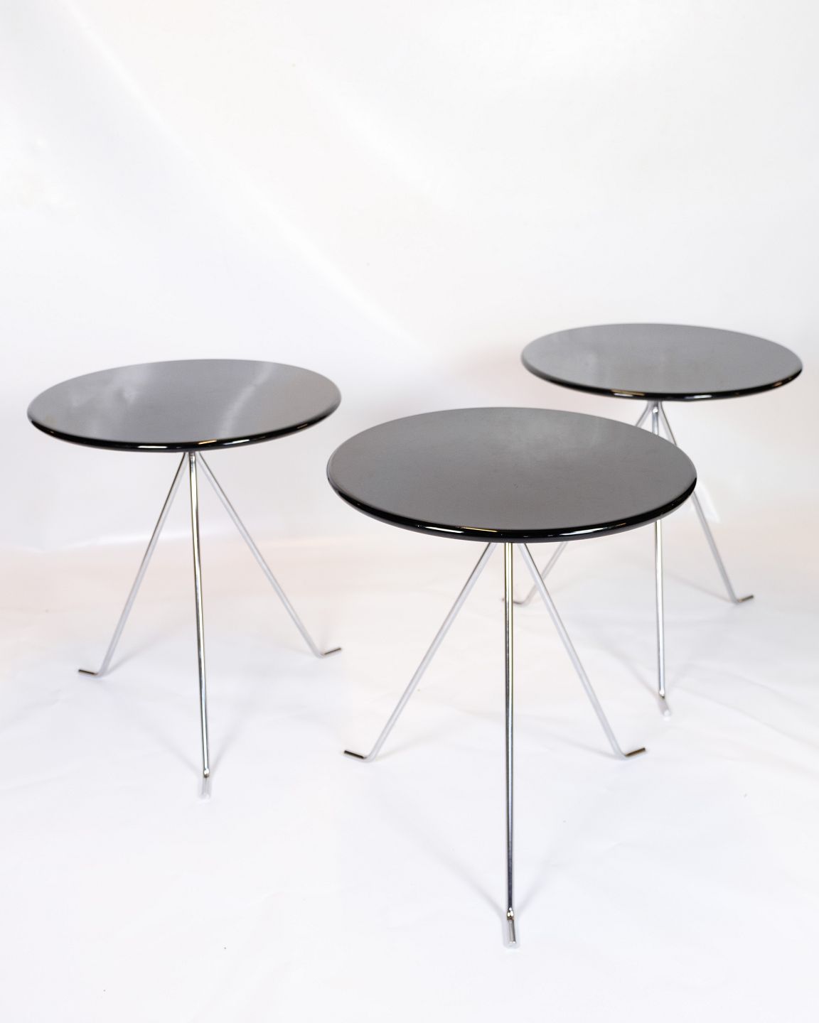 Sofabords sæt bestående af 3 små runde borde med krom ben med folde mekanisme og sort overflade originalt fra Danmark.
