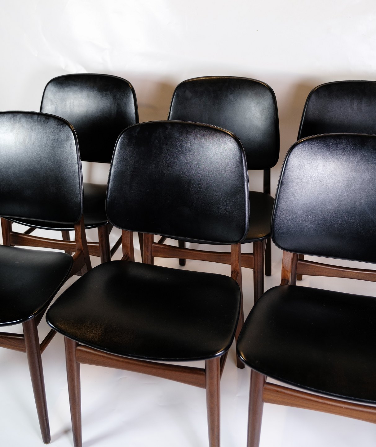 SoldA set of six faux leather dining chairs, designed and manufactured by a Danish master teak cabinetmaker from around the 1960s, represents an era of excellent craftsmanship and timeless aesthetics.