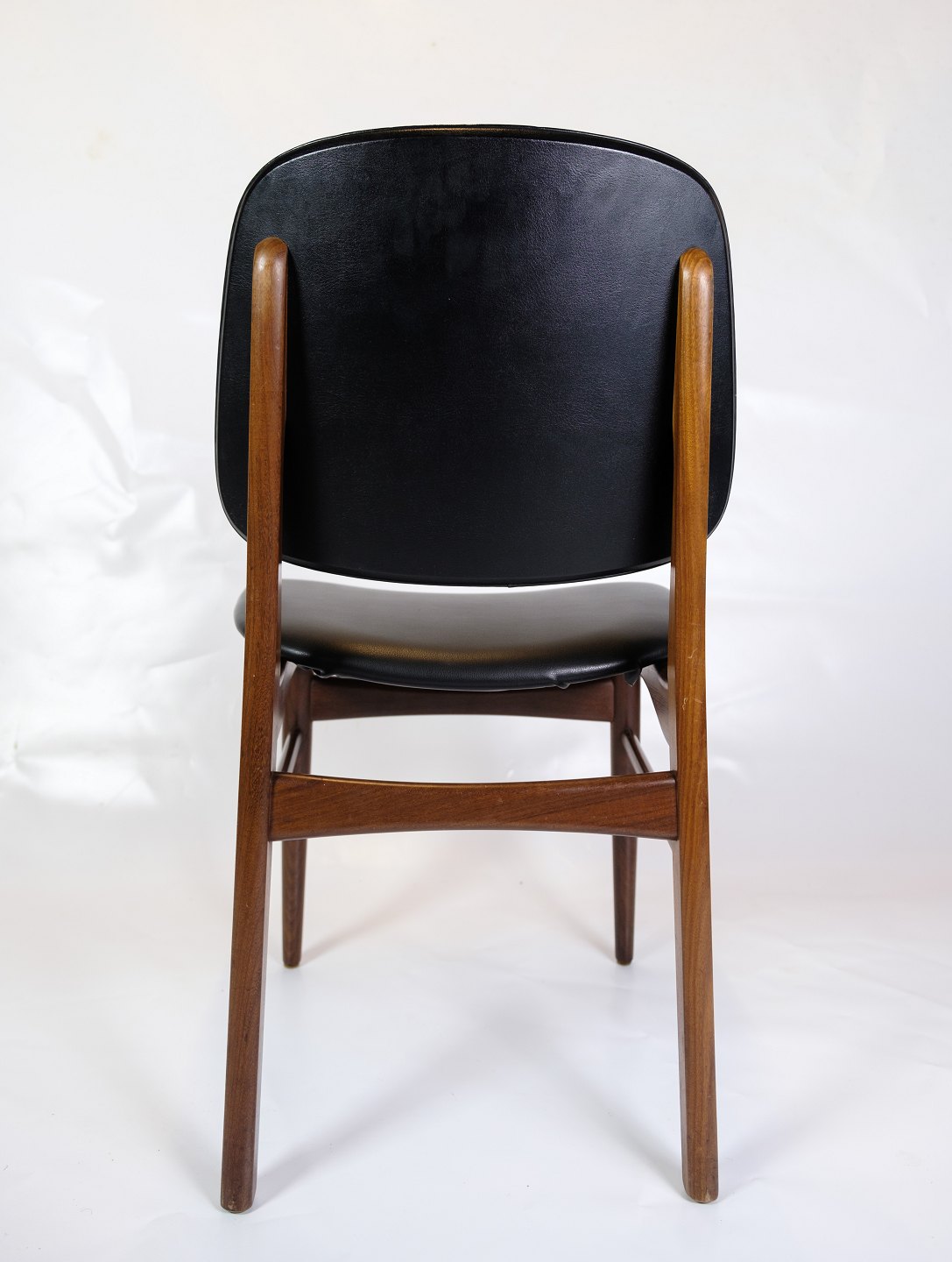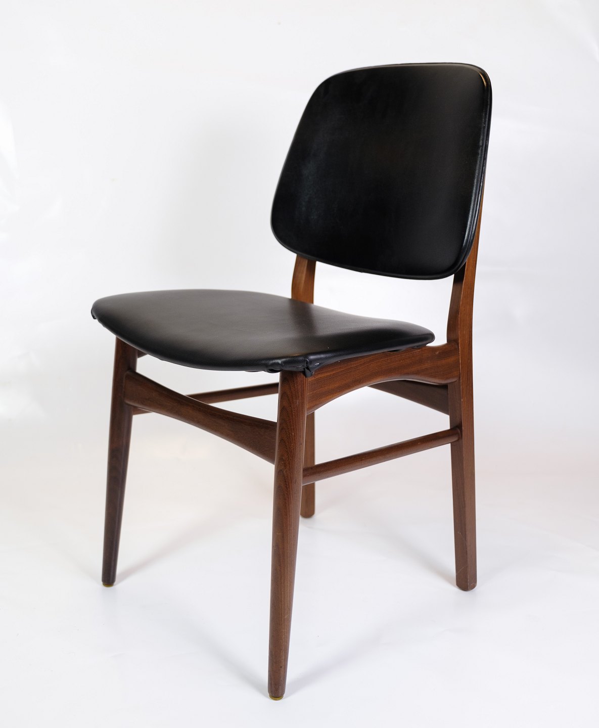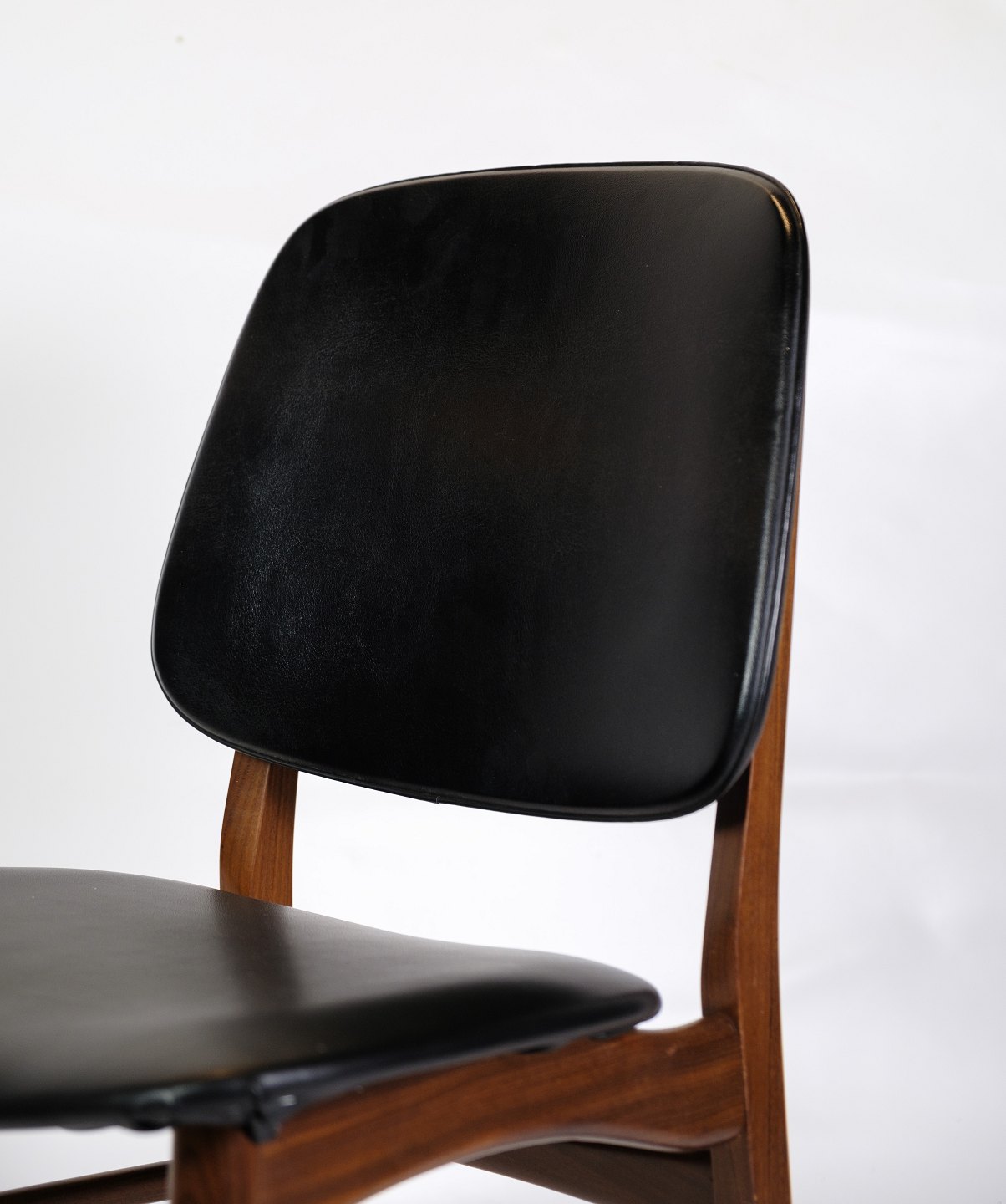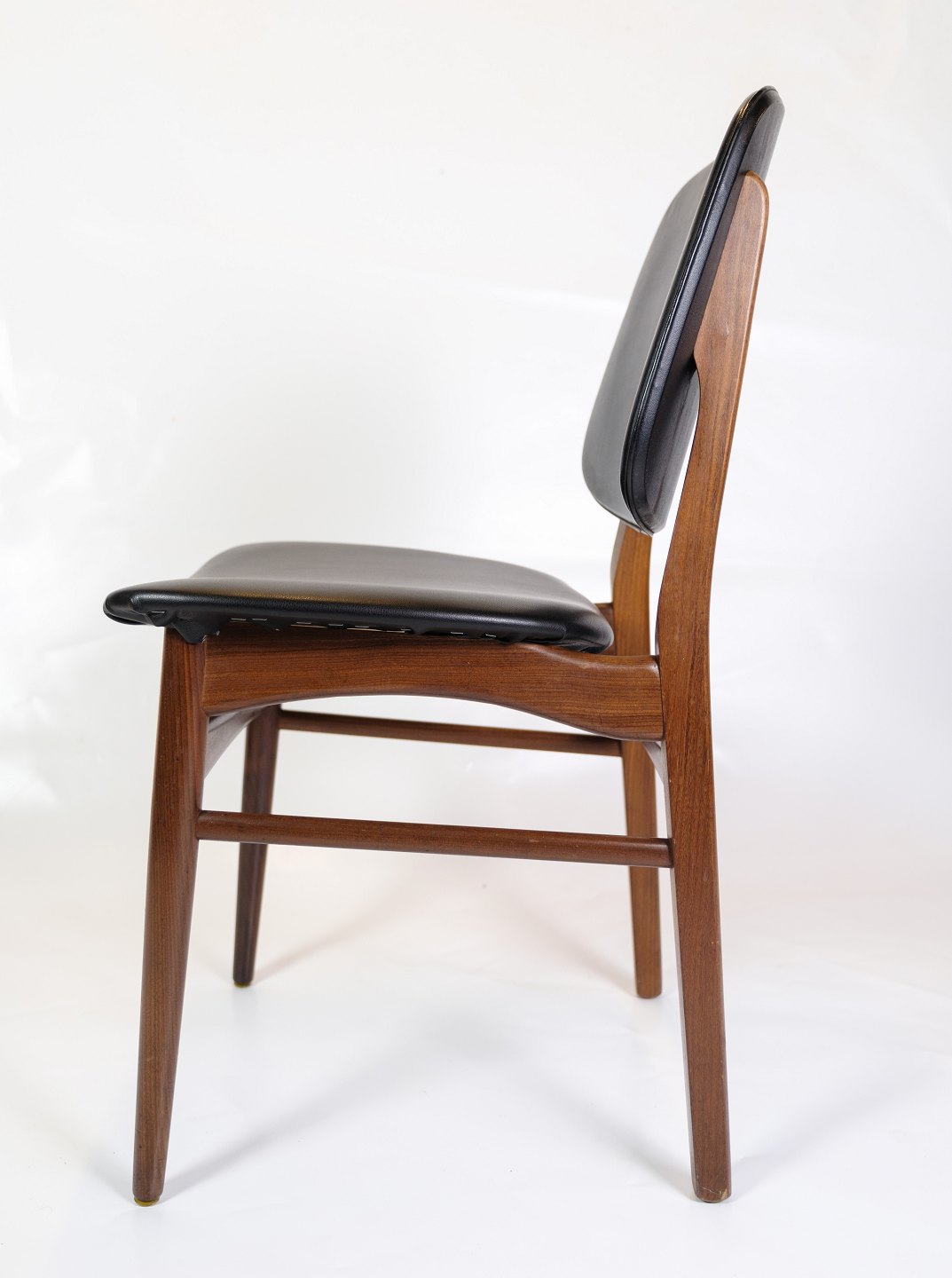 The chairs from the 1960s reflect the design aesthetic of the era with their clean lines and period design. The teak's warm color tones and beautiful grain structure, combined with the upholstered artificial leather, create a harmonious balance between comfort and style.